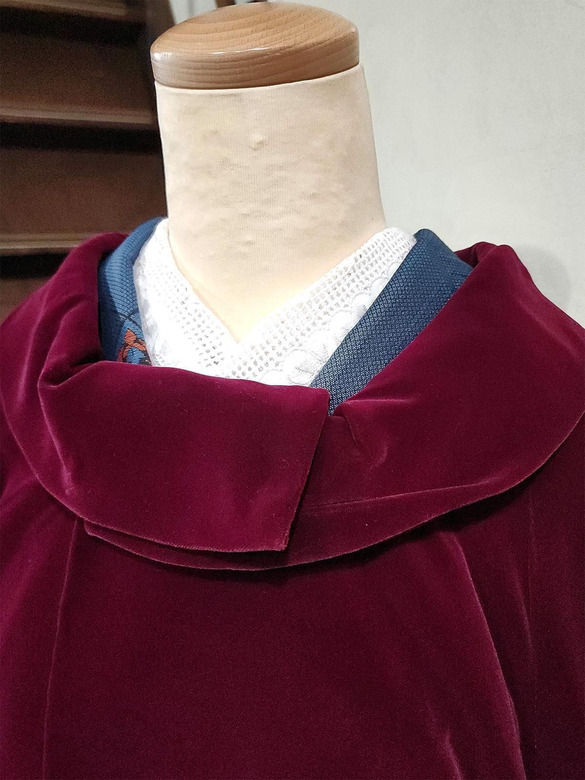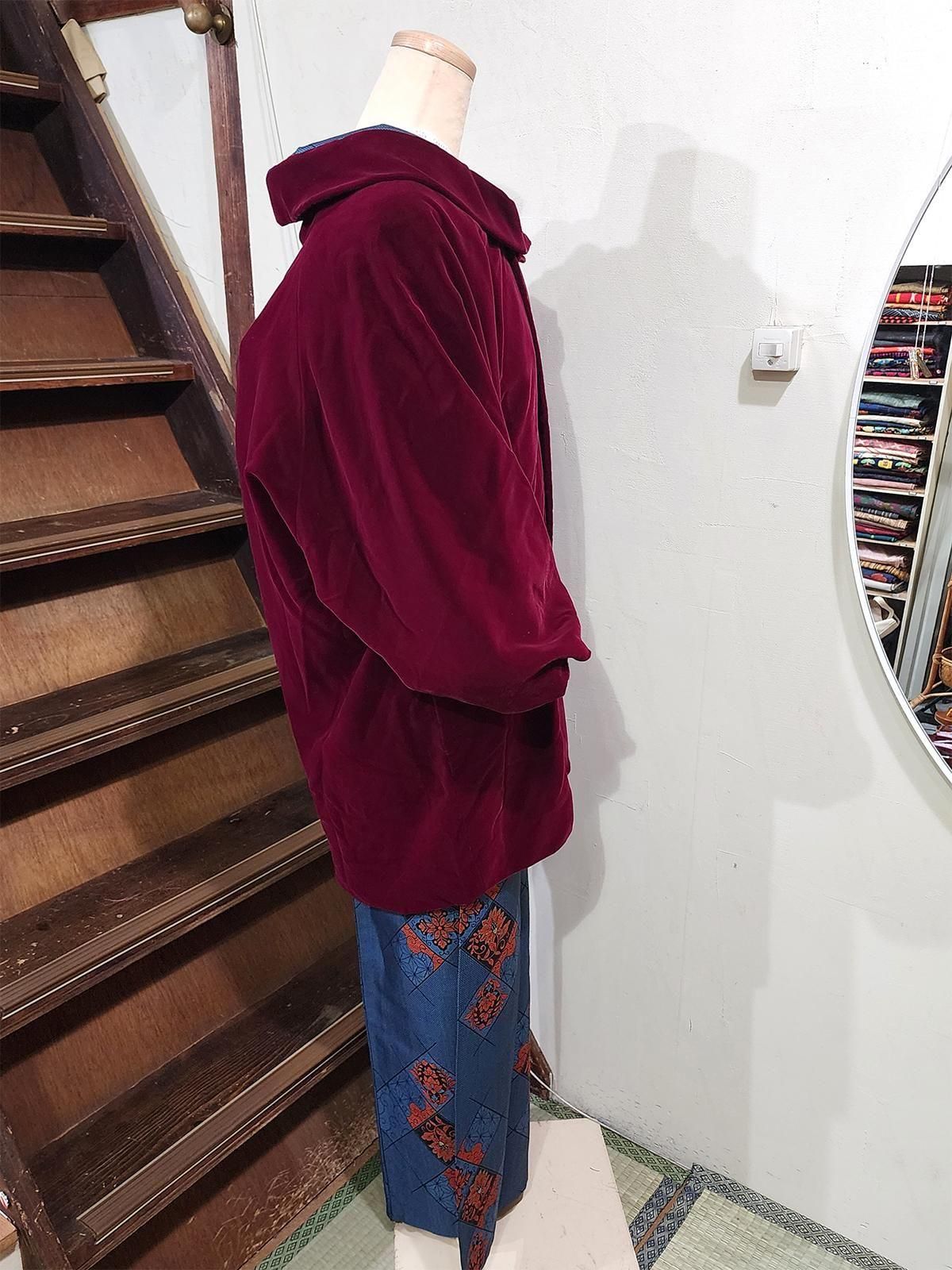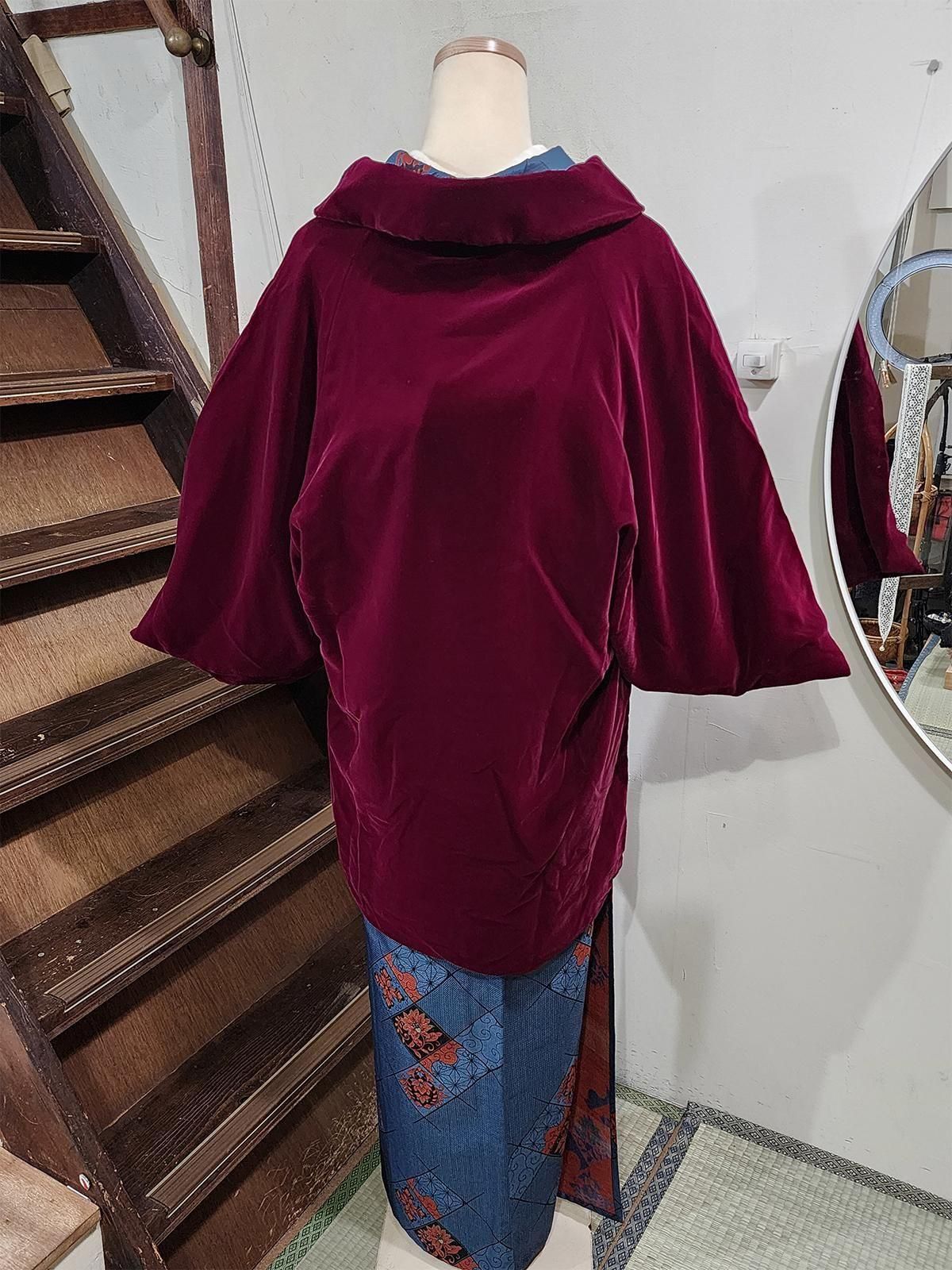 深みのあるワインレッドにモードな衿がアクセントになったベルベット着物コート。