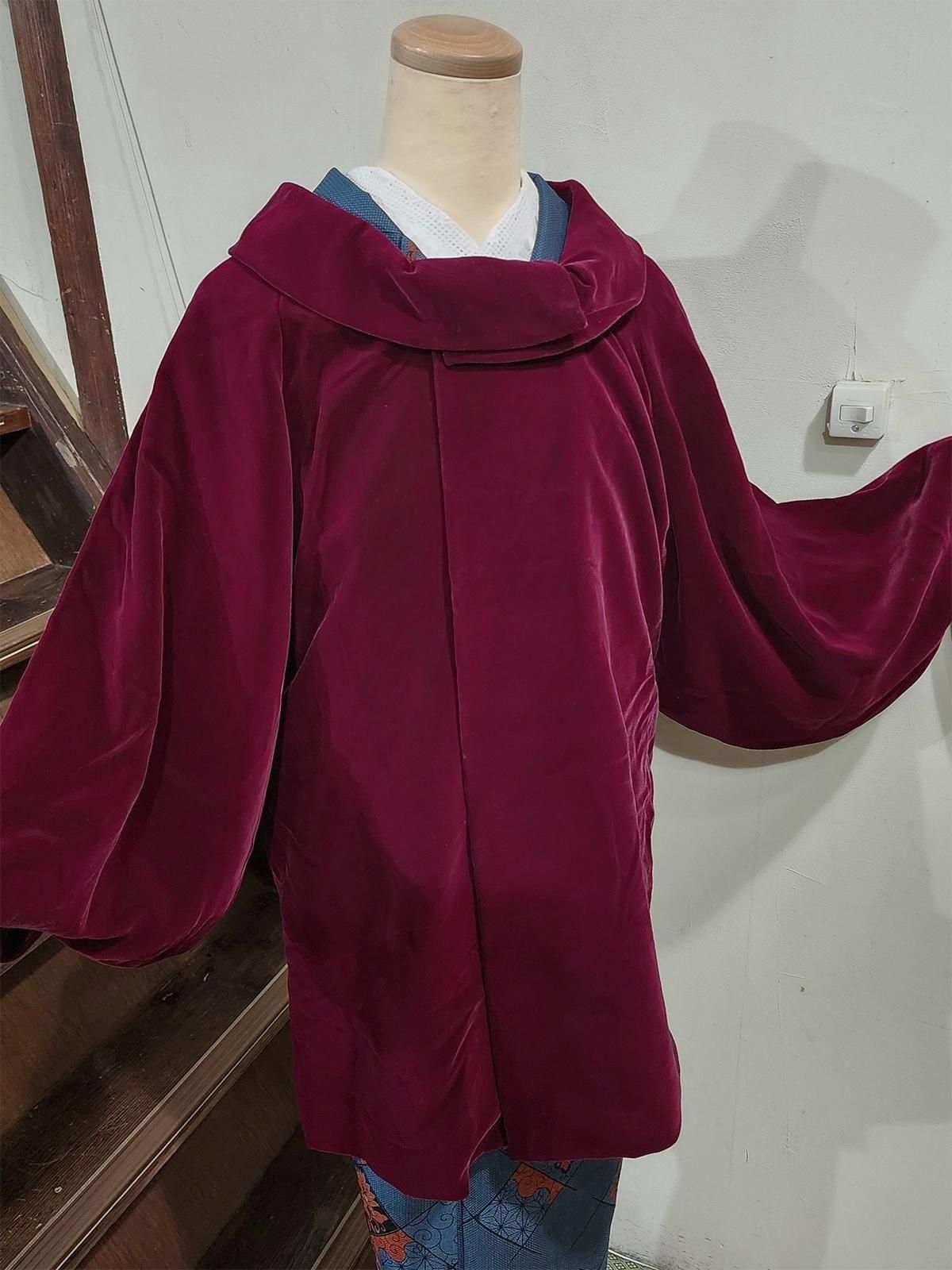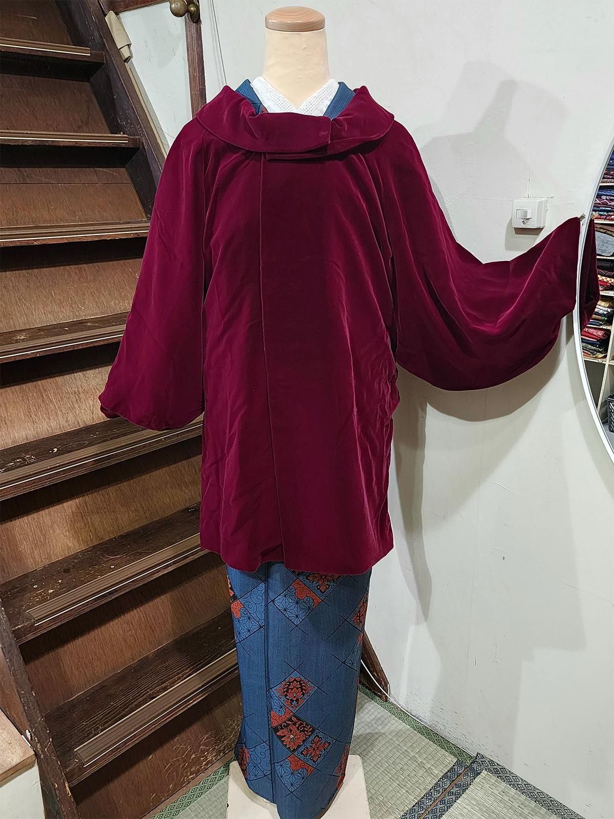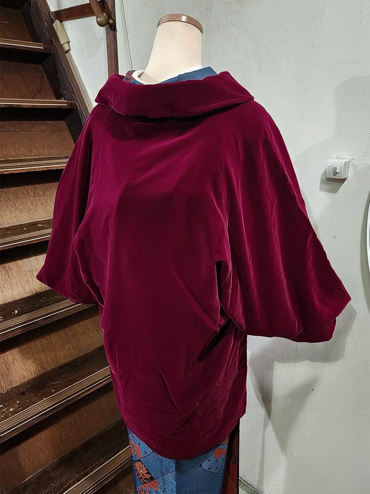 深みのあるワインレッドにモードな衿がアクセントになったベルベット着物コート。