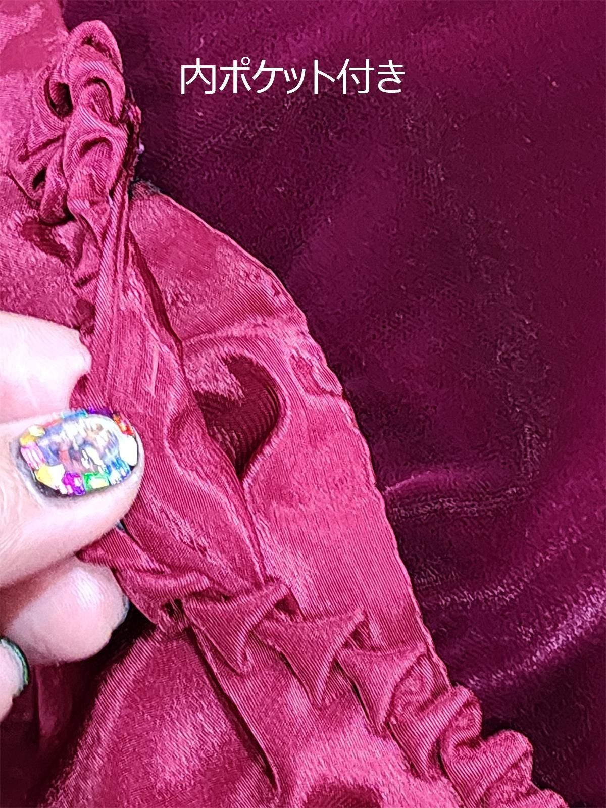 - デザイン:深みのあるワインレッドのカラーと上品な光沢にうっとり。50年代クチュールを思わせる完成度の高いシルエットに、愛らしさとエレガンスを両立するモードな衿がアクセントになった上質なベルベットコート。便利な内ポケット付き。