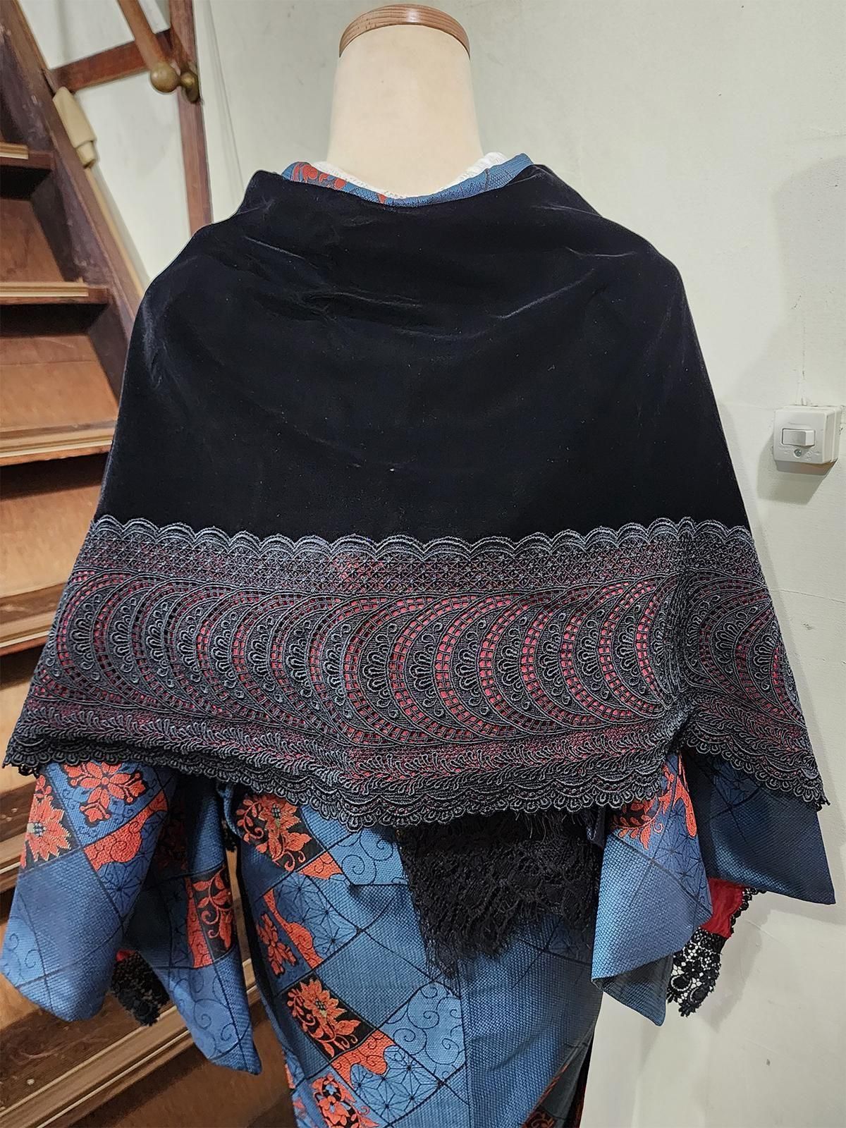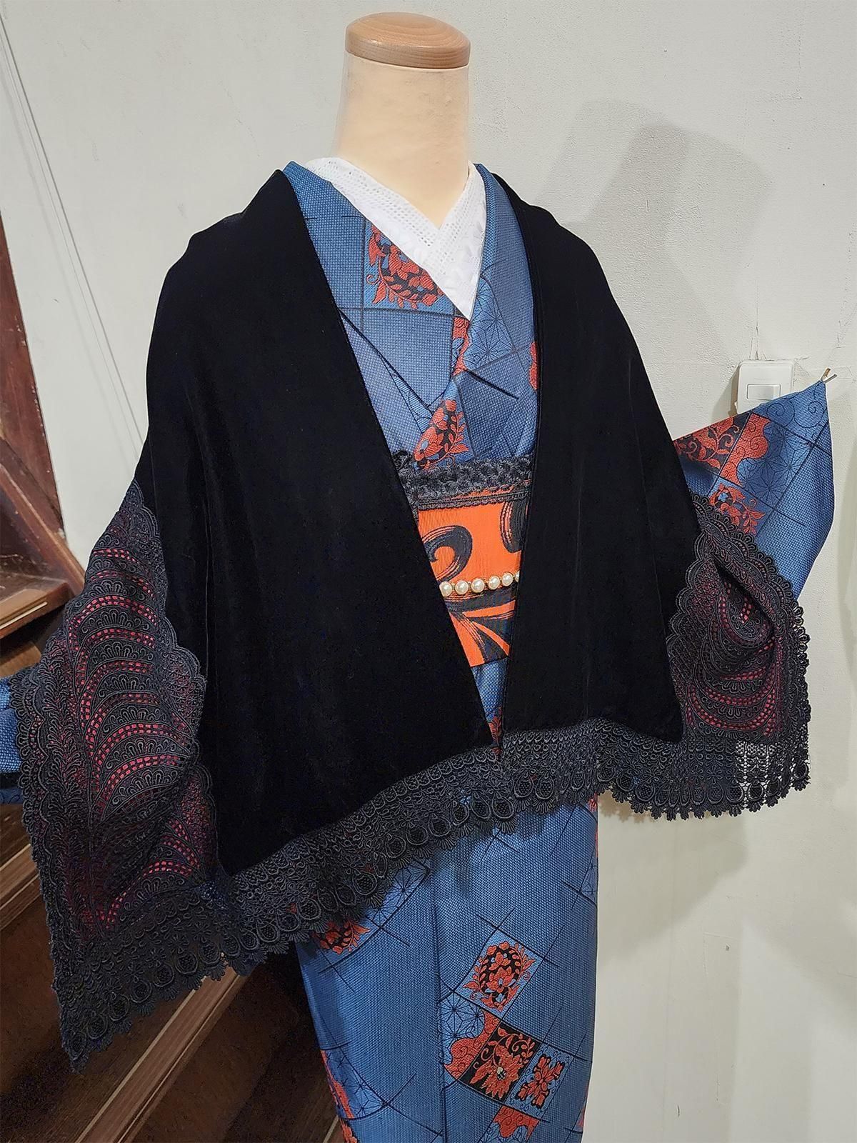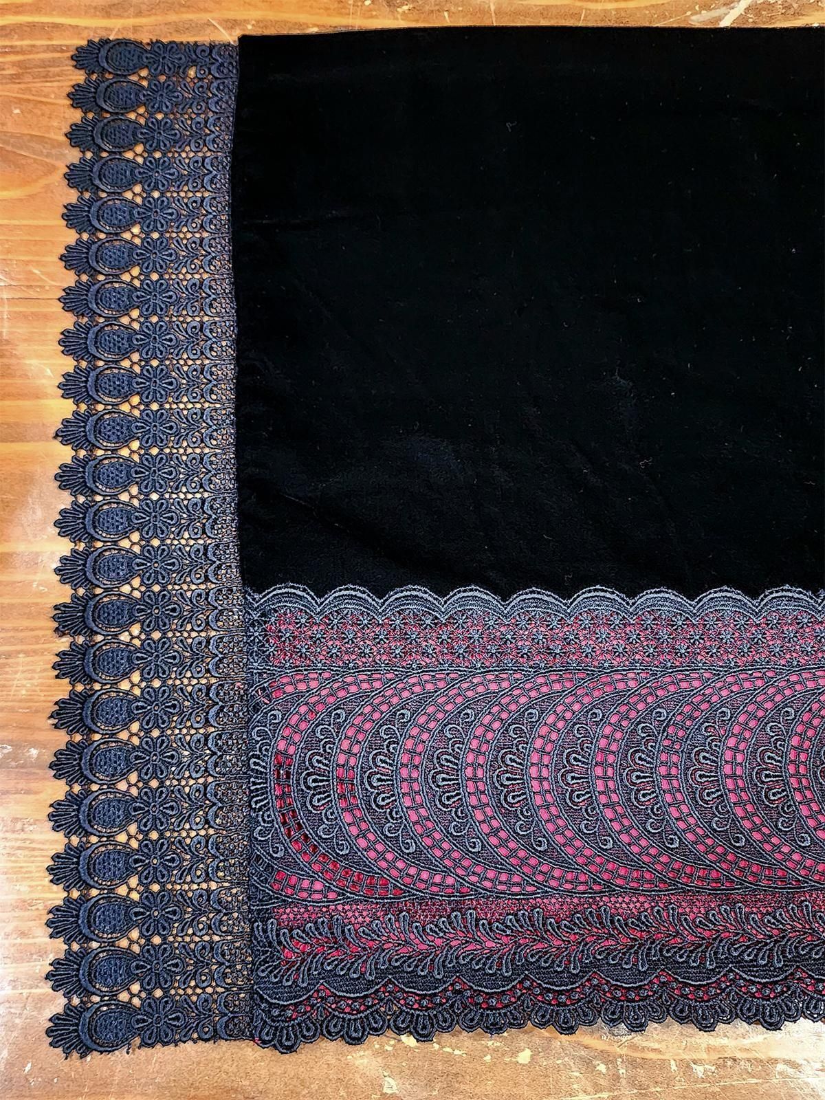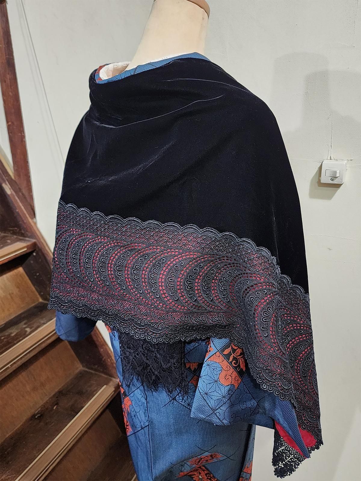 シックなブラックベロアに、アール・ヌーヴォーデザインを思わせるような繊麗なレースの縁飾りがドラマチックな詩情を添えるビンテージのベロアショールです。裏地の深いルージュレッドがレース飾りを透かしてほのかに垣間見えて、さりげないアクセントを添えてくれます。