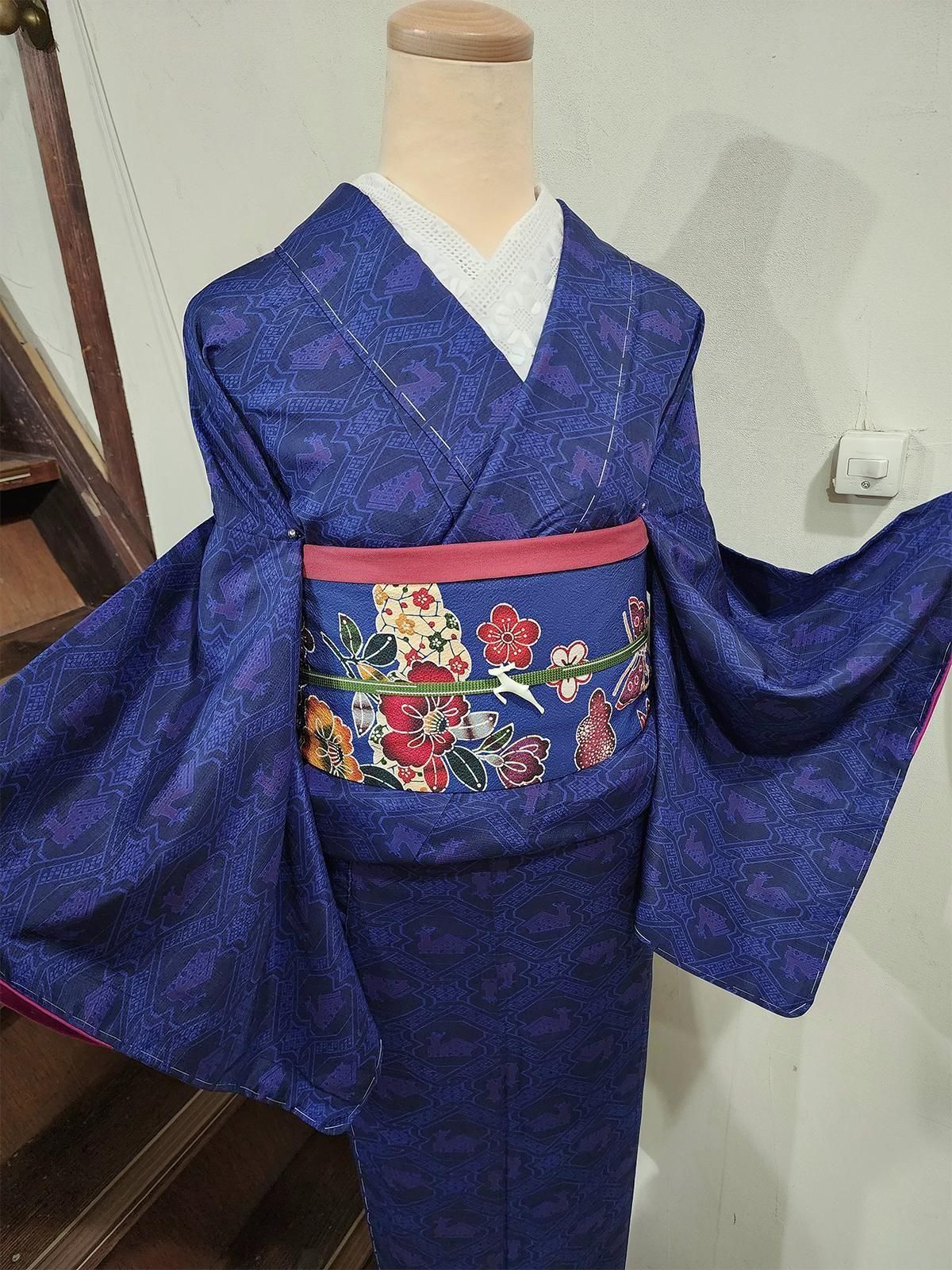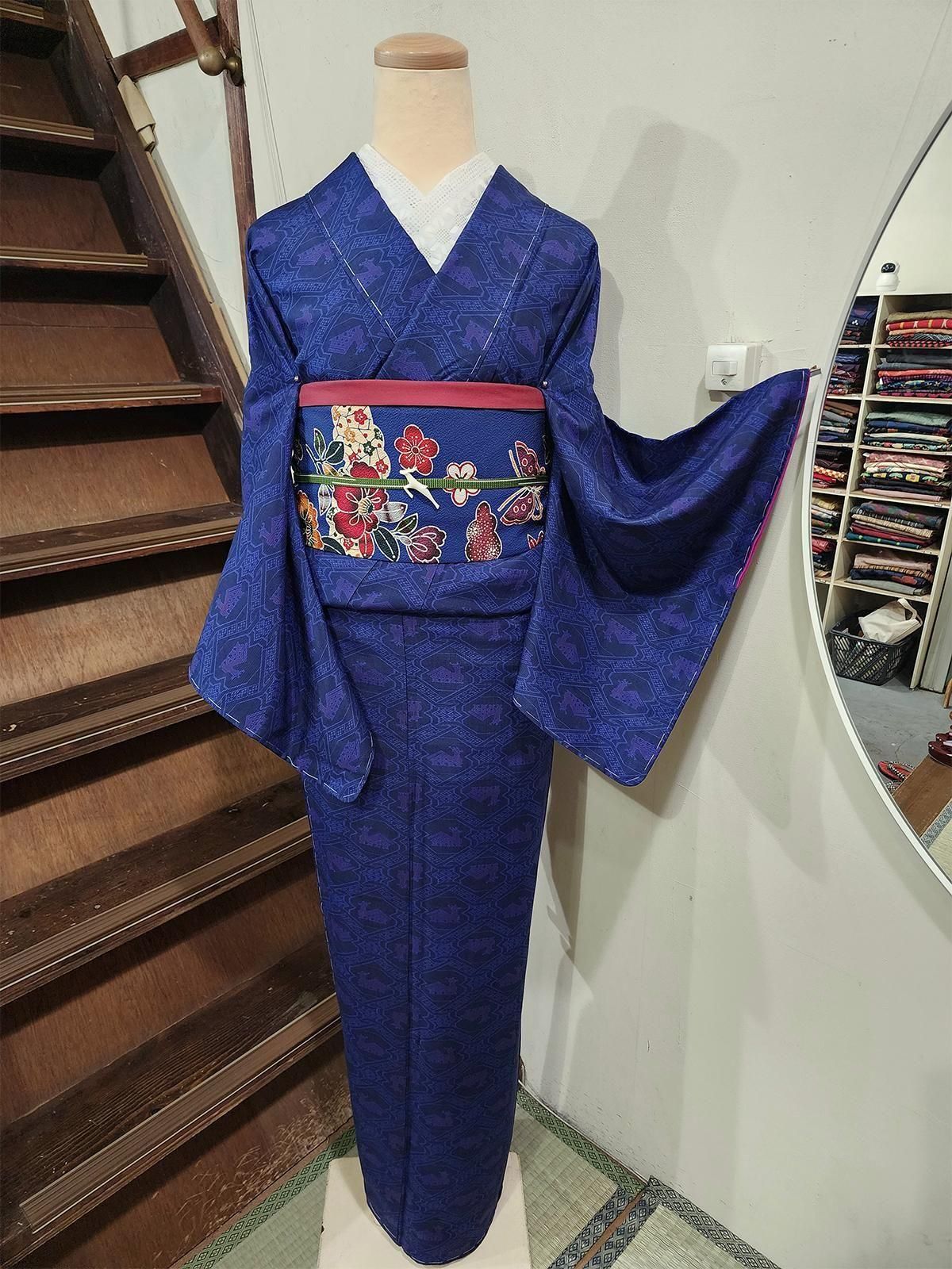 - コーデ提案:深い紺と紫の世界観を活かし、赤や葡萄色の帯で大人の華やぎを引き寄せるコーディネートが素敵。白系や銀鼠の帯で透明感を演出しても上品にまとまり、山吹色や緑を差すとアートのような個性が際立ちます。帯揚げや帯締めに、八掛の赤紫をリンクさせると、洗練された統一感が生まれます。