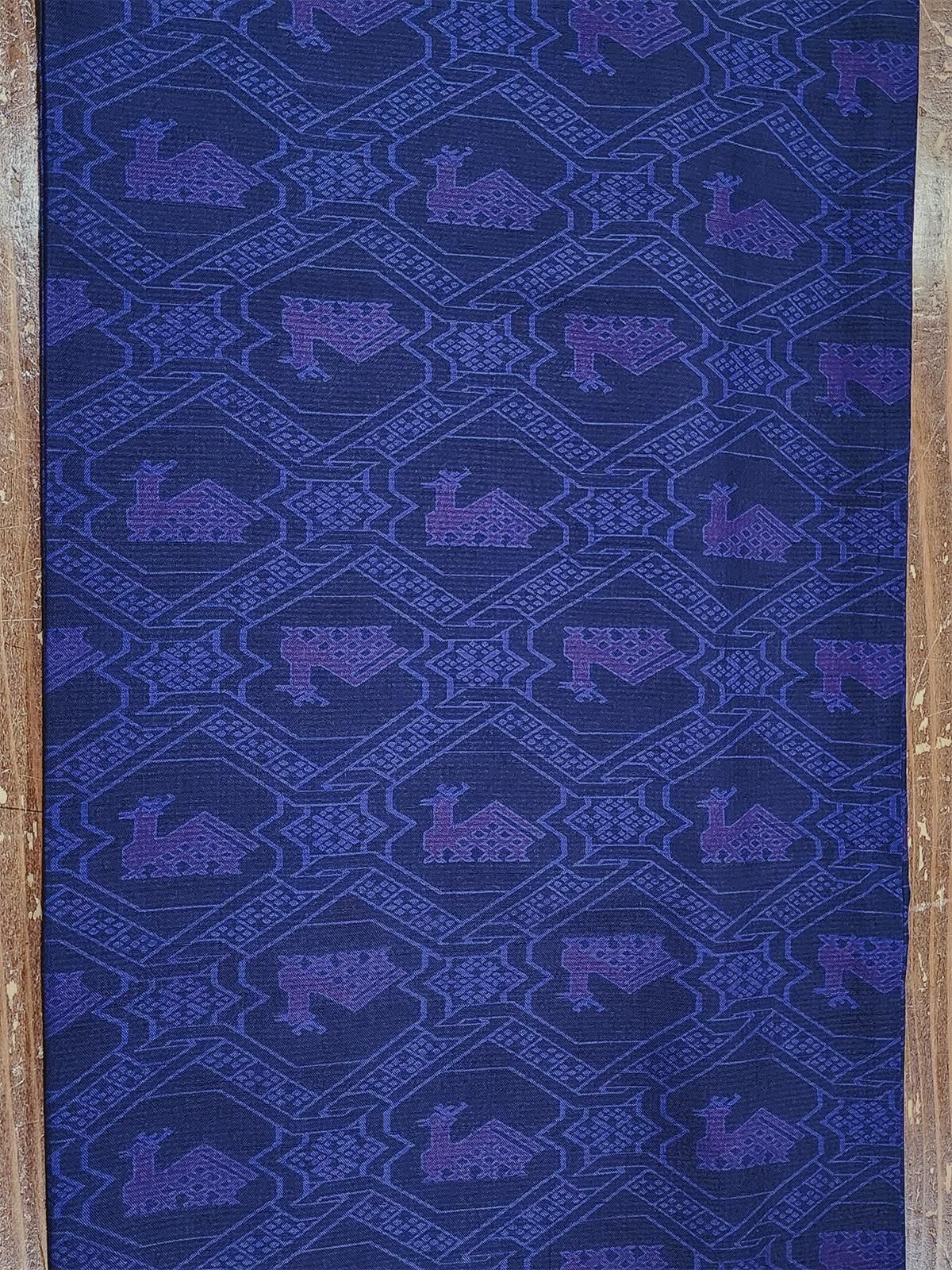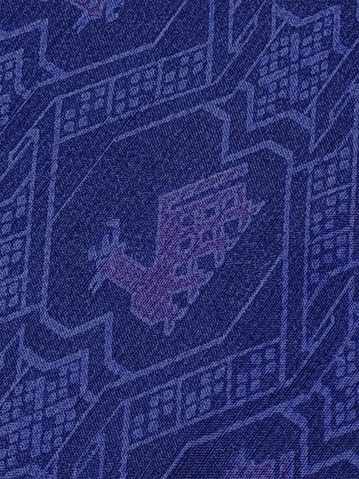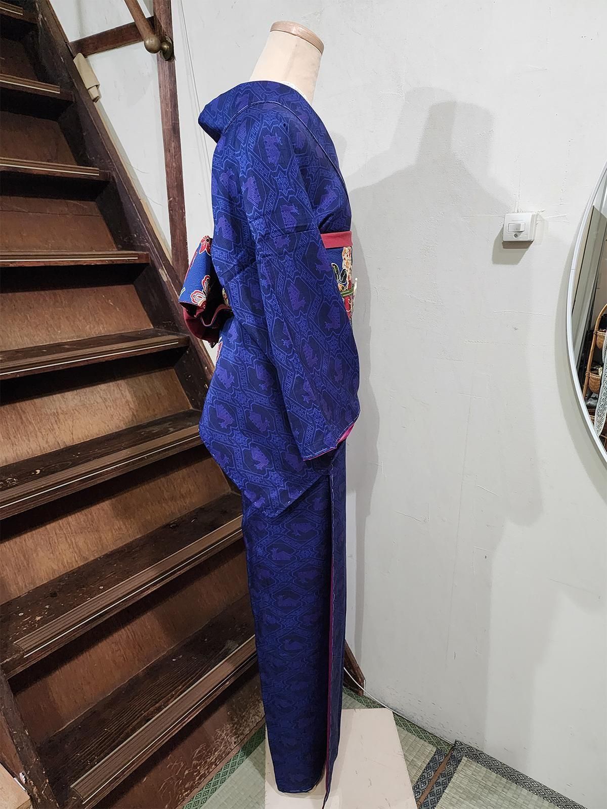 - デザイン:夜更けの空を思わせる濃紺を背景に、紫青と葡萄紫の糸で有栖川文様が端正に織りだされたデザイン。幾何文様と動物文様が規則正しく連なり、古典の息づかいをモダンに昇華させています。八掛には鮮やかな赤紫のぼかしが添えられ、裾さばきにひとさじの華やぎが灯ります。