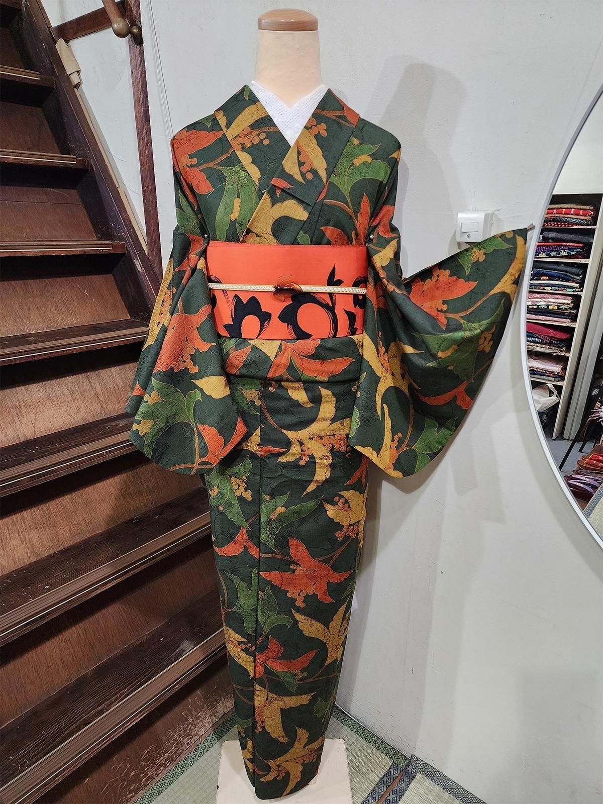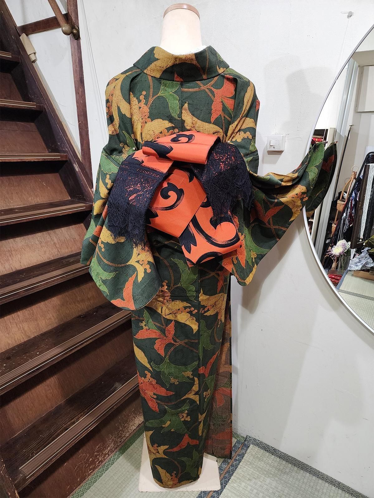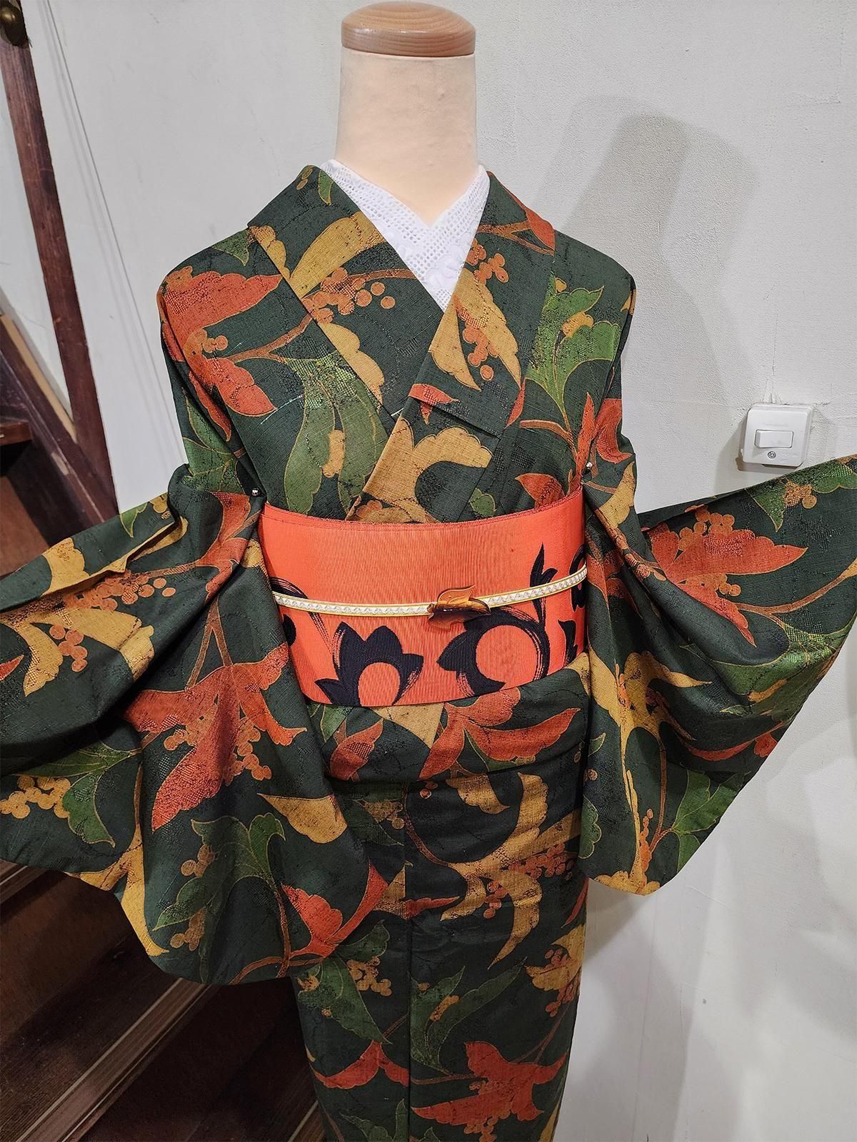- コーデ提案: 写真のようにオレンジやからし色の帯を合わせれば、ぬくもりのあるコーデに。黒やこげ茶の帯で引き締めればぐっと大人っぽく、グリーン系の帯でボタニカルなニュアンスを深めるのもおすすめです。