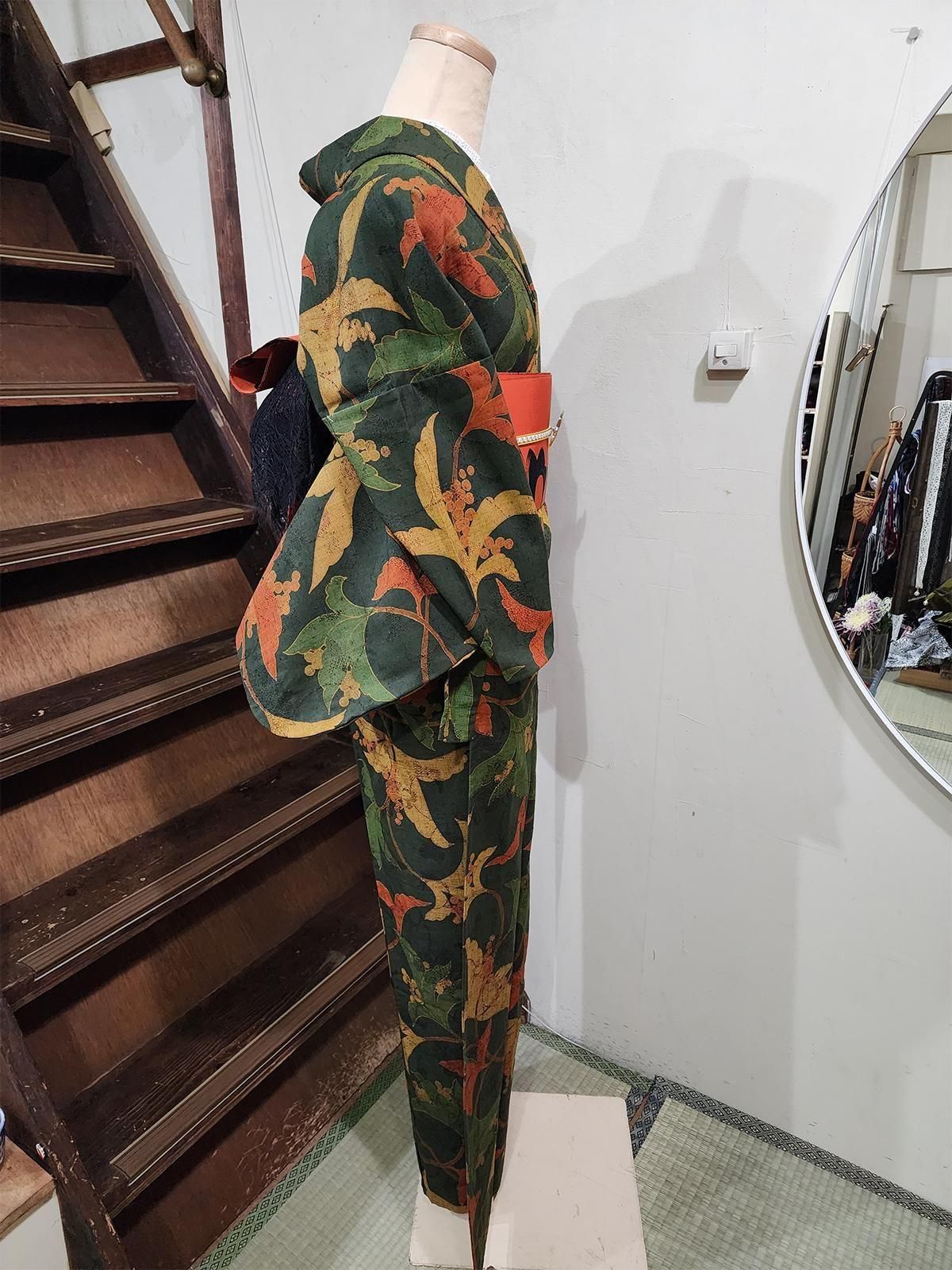 スモークがかった深く落ち着いたハーバルグリーンに、木の葉と木の実が揺れるボタニカルデザインが染め出されたしょうざんウール単着物