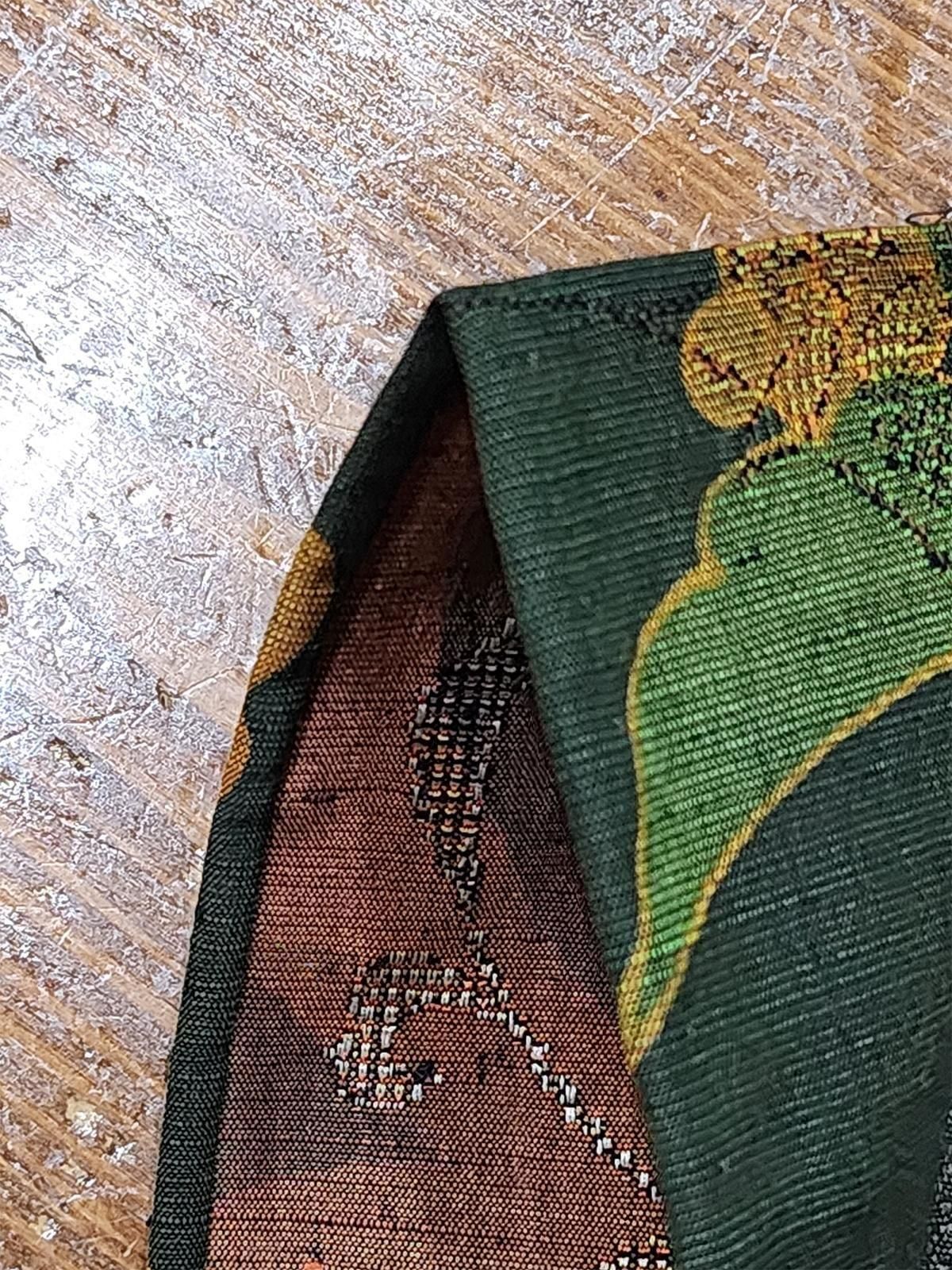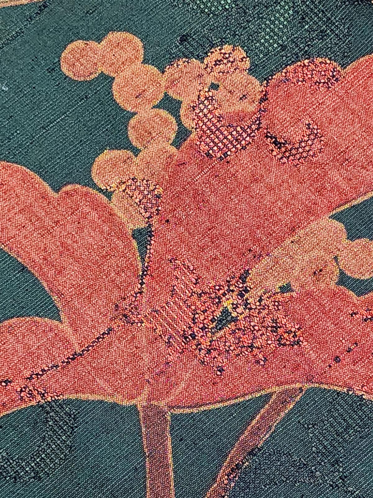 - デザイン: カーキグリーンに近い深いみのあるスモーキーなグリーンをベースに、大きな木の葉と木の実が、のびやかな曲線を描いて広がるボタニカルデザイン。ウィリアム・モリスのファブリックのような大胆な遊び心と洗練された美を感じる一枚。しょうざんウールならではの優雅な織り模様が、グラフィカルなデザインに奥行きと深みを添えています。