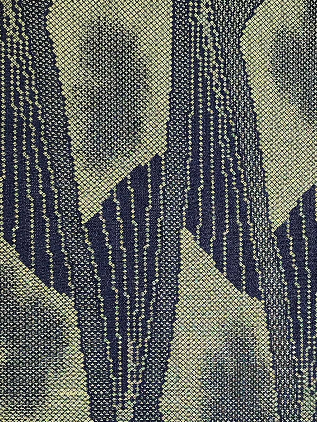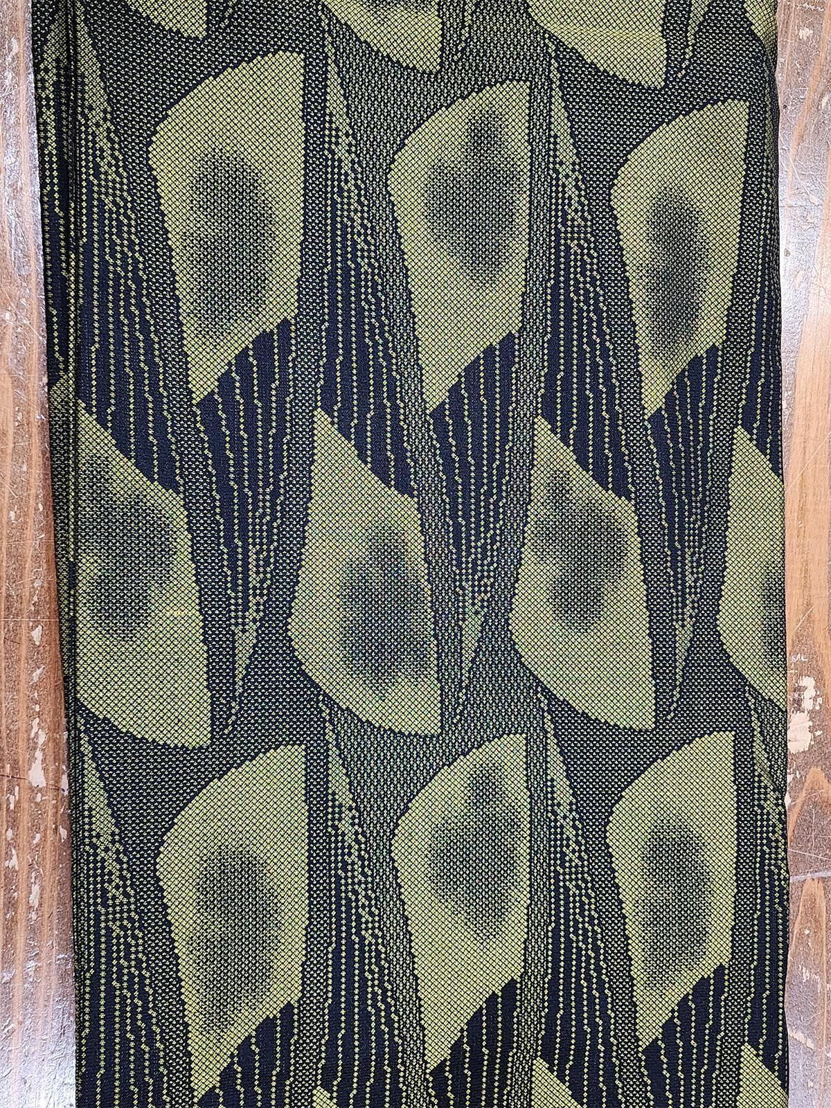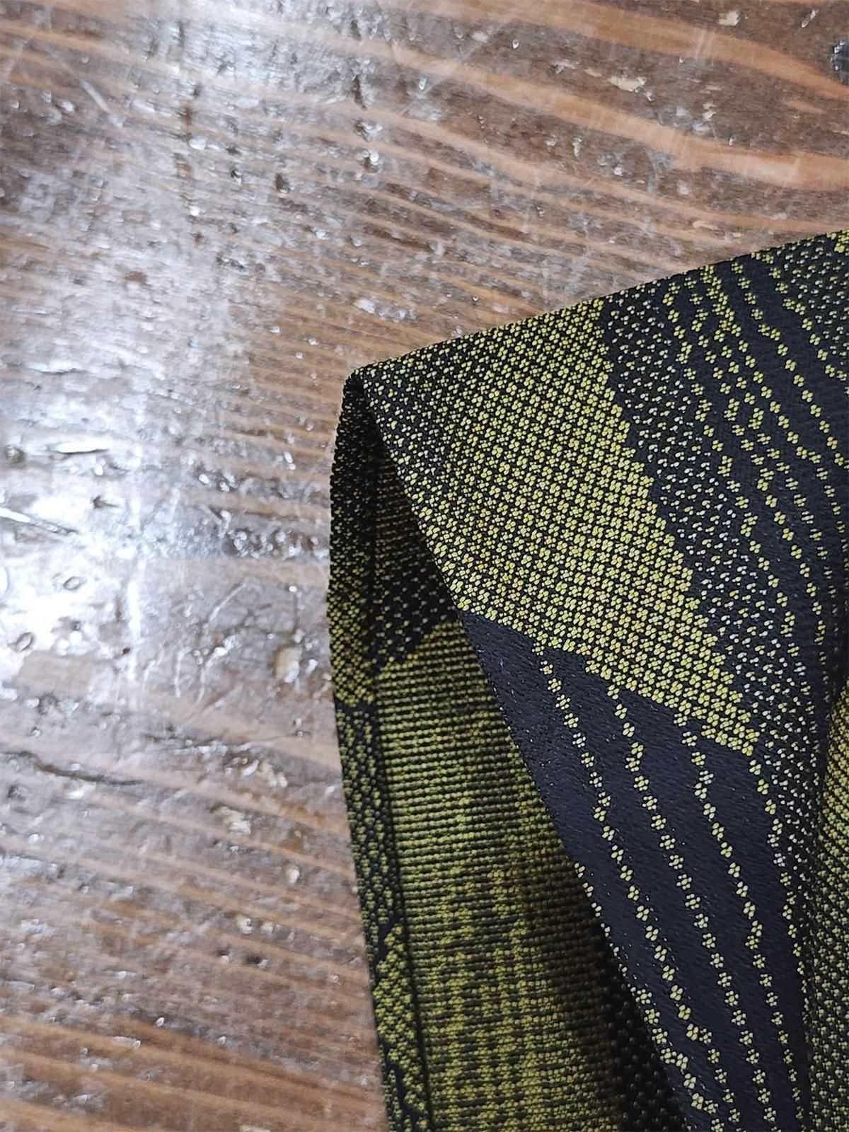 - デザイン:シックなブラックとイエローゴールドのようなメタリックカラーで織りだされた、銀杏の葉のような扇のようなモチーフが連なるグラフィカルなデザインがモダンアートのよう。細かな織り模様がニュアンスある陰影をつくり、マットなツヤ感のある生地が光の加減で立体的な表情を生み出します。