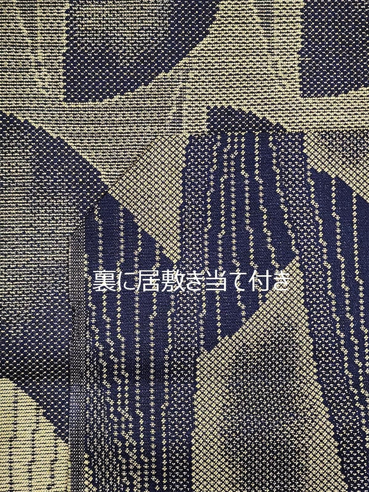 メタリックイエローとブラックのモダンパターンがリズミカルに揺れる、アートなシルクウール単着物