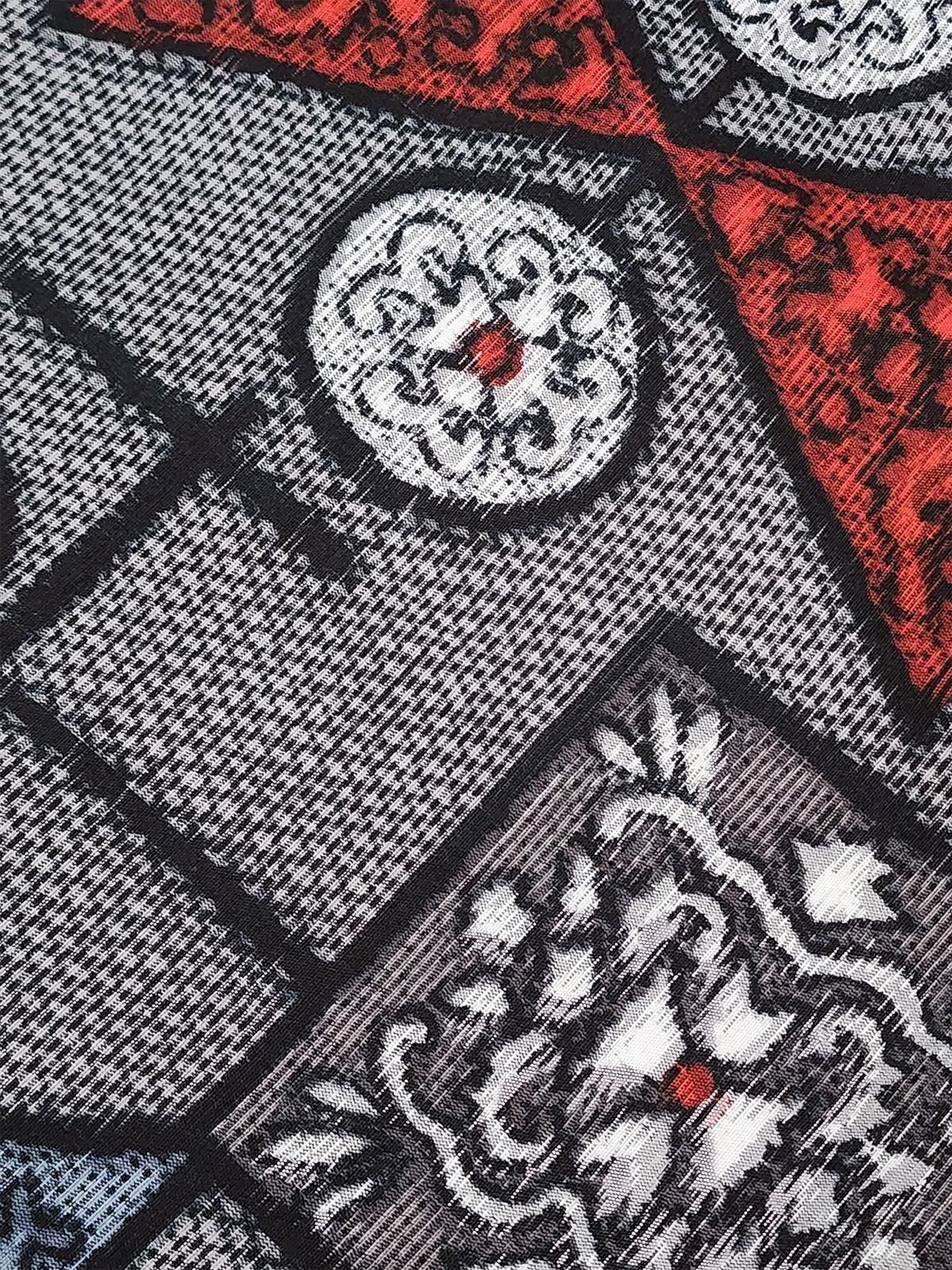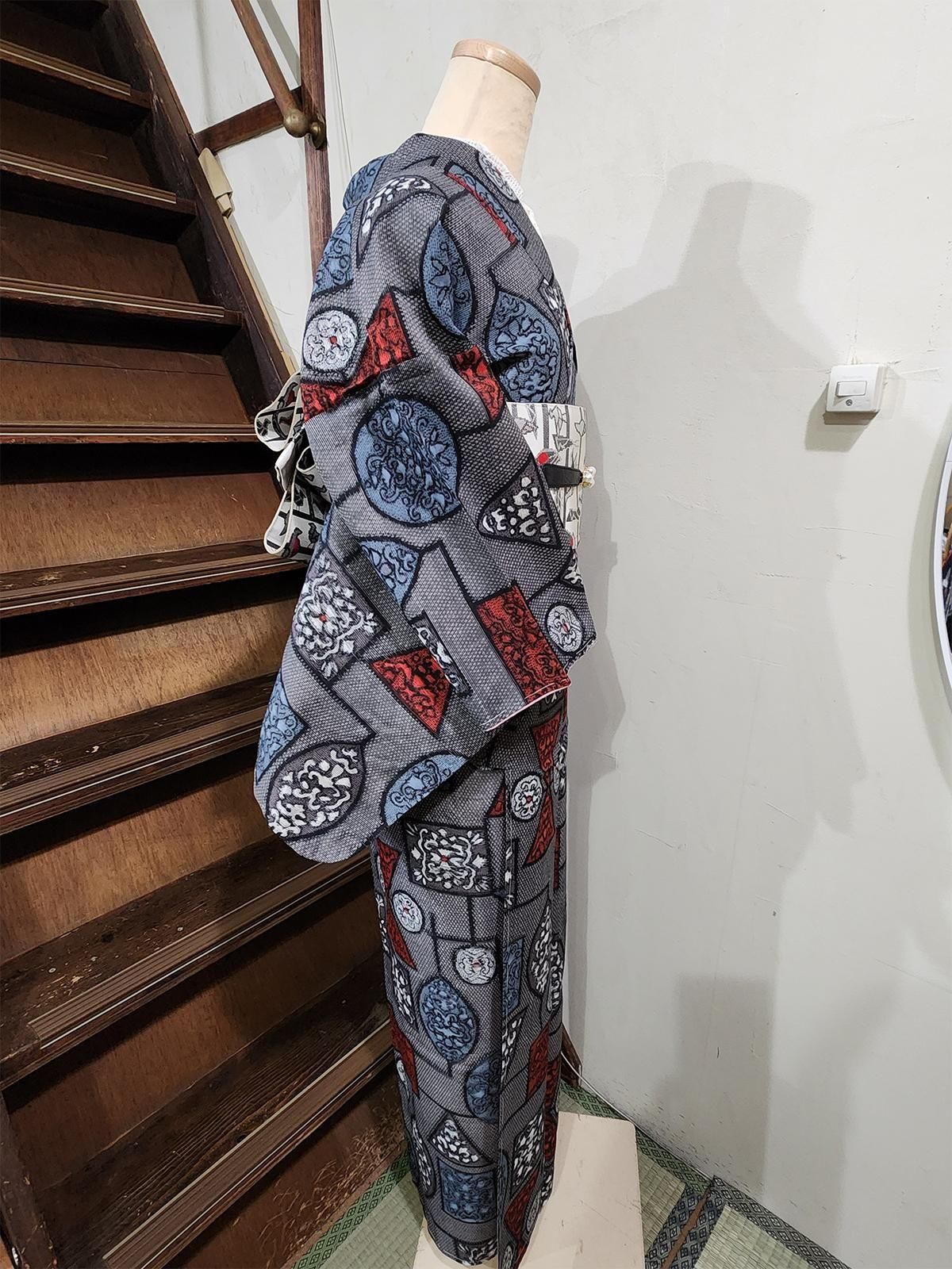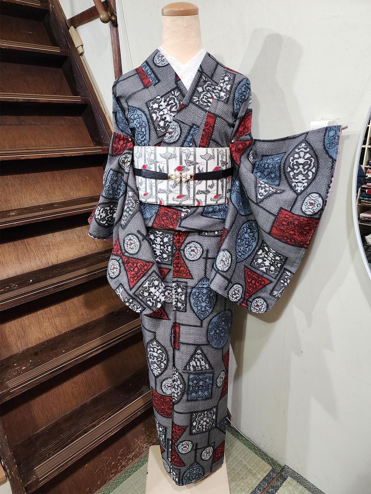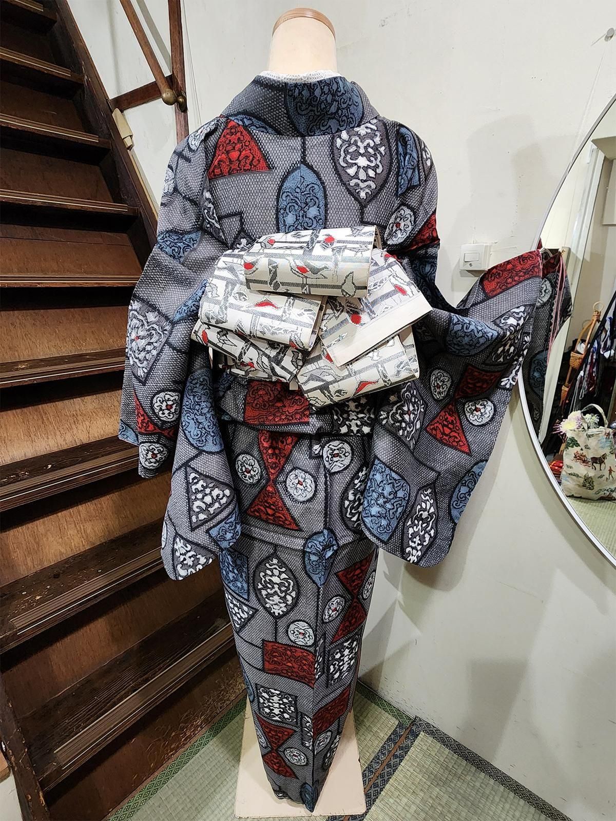 - デザイン: 繊細なダイヤモンドチェックに、ゴシック調のロマンを感じる優美な装飾模様で飾られたモダンな幾何学パターンが織りだされた銘仙ならではのドラマチックなデザイン。シックなモノクロームに、ルージュカラーとスモークがかったパウダリーなブルーが映え、ロマンチックな詩情を高めてくれています。