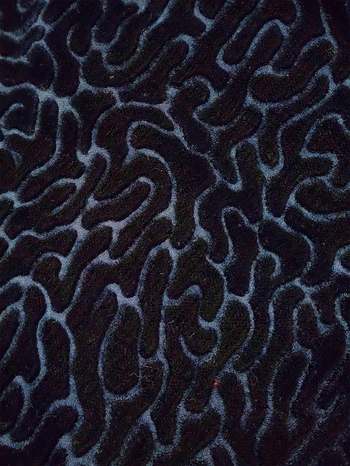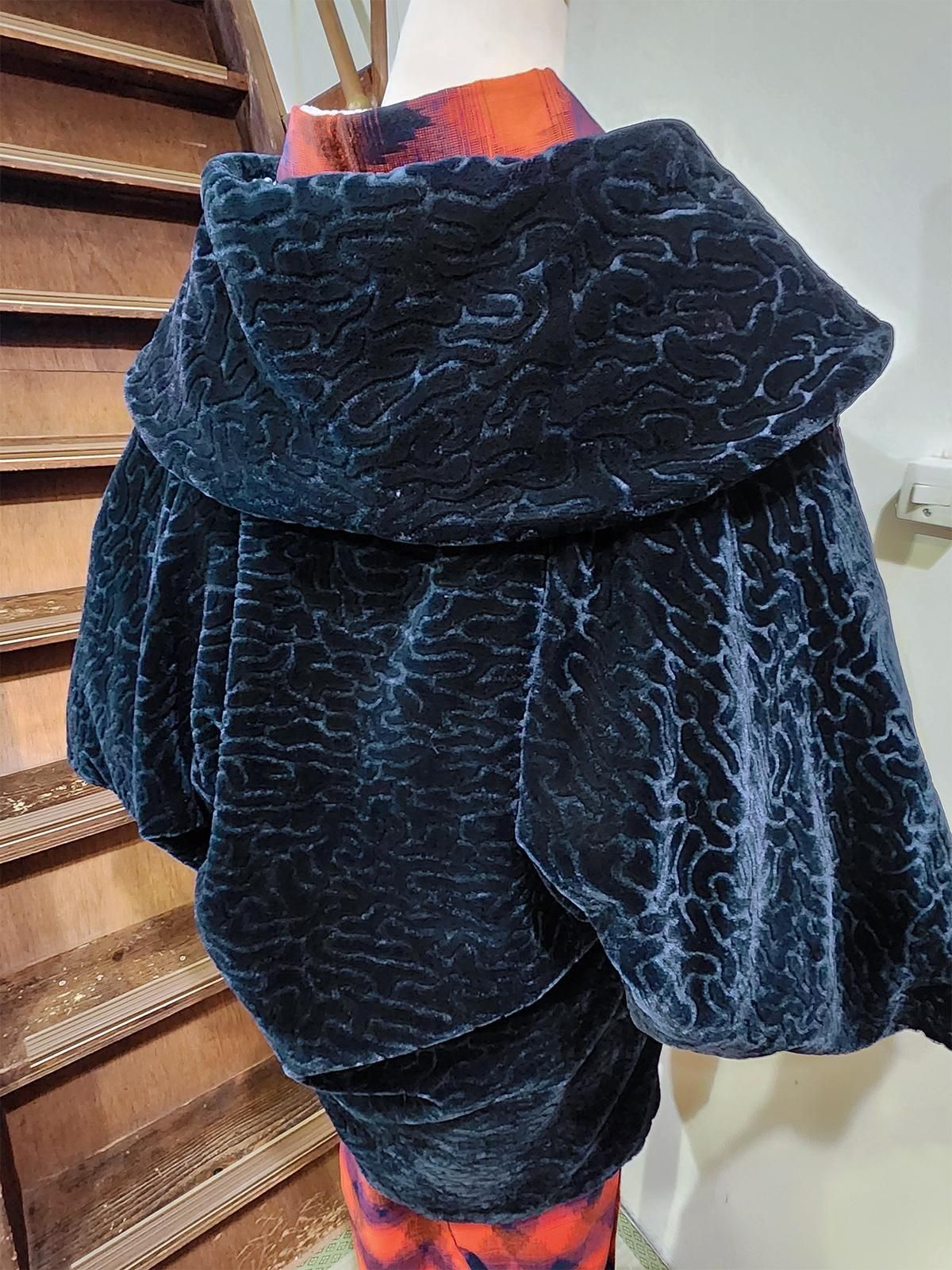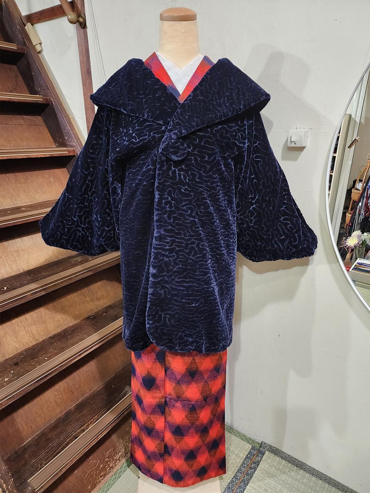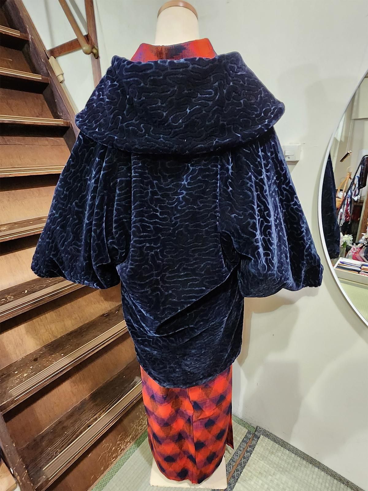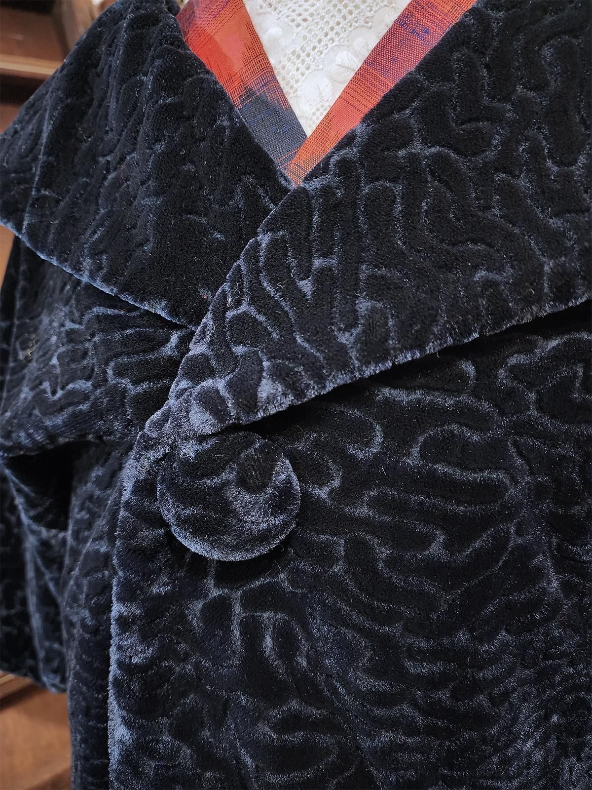 - デザイン:深いミッドナイトネイビーの地に、切りビロードのような立体的なテクスチャでモダンアートのような抽象デザインが浮かび上がるモードな着物コート。ショールカラーのように大きい衿と、ころんと丸いくるみボタンがビンテージらしい遊び心を添えてくれます。光の加減で青の色合いが強く見えたり、ぐっと沈んで黒に近く見えたりします。