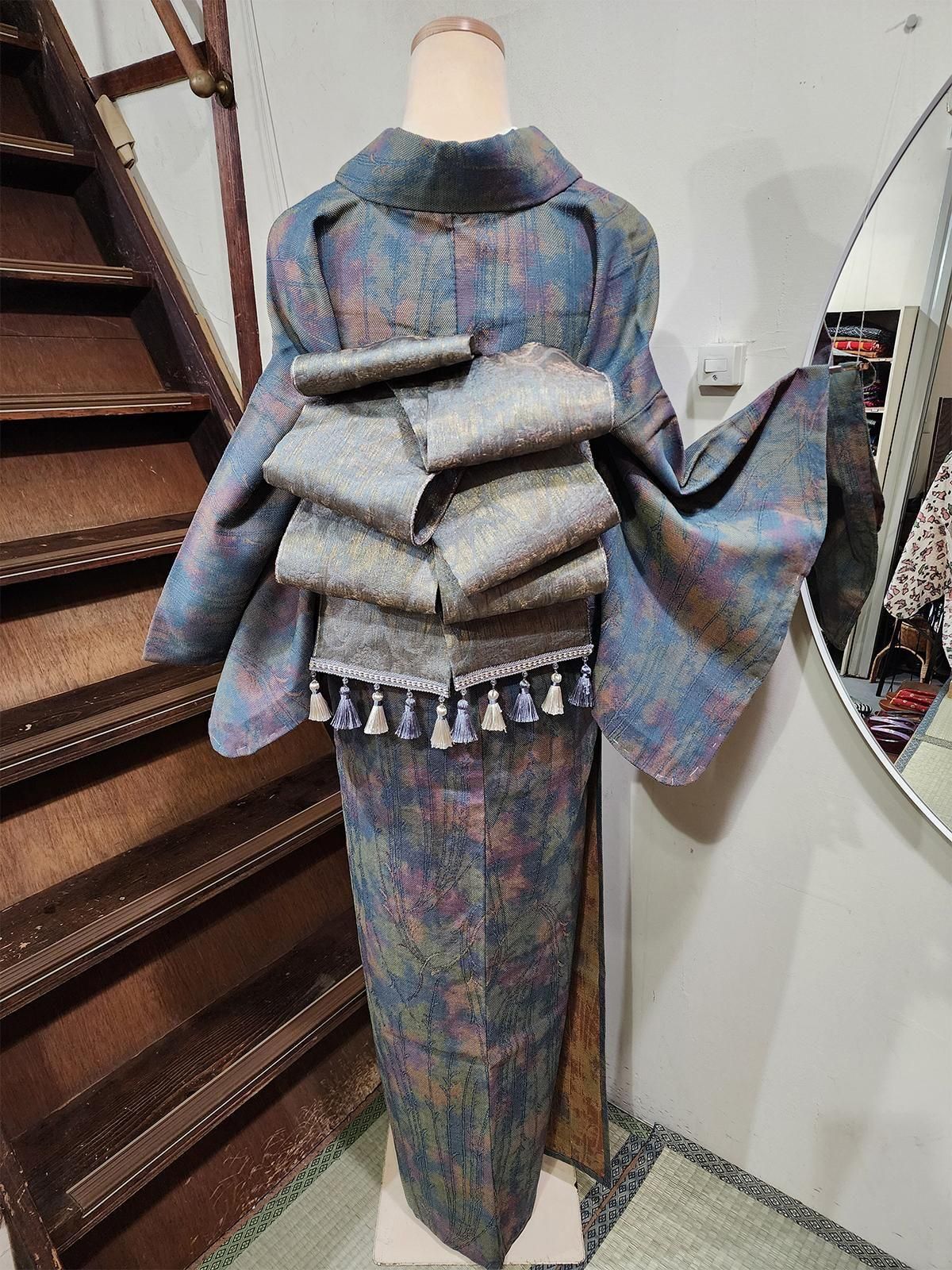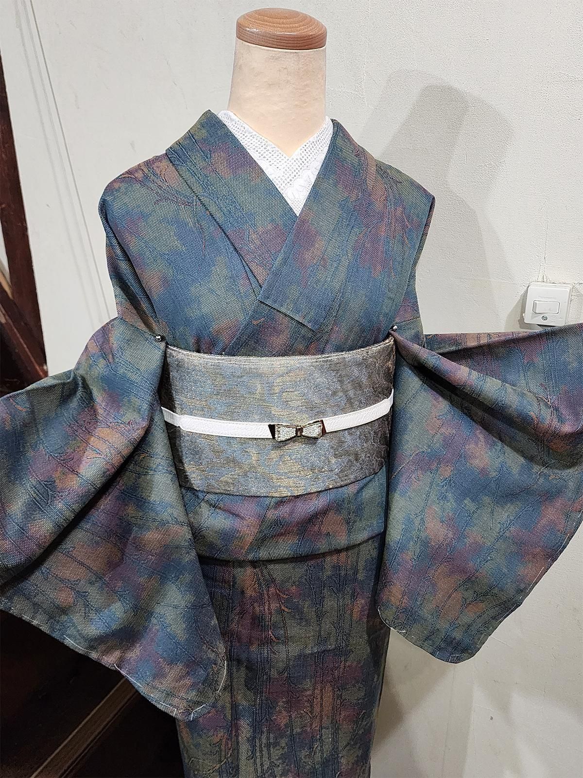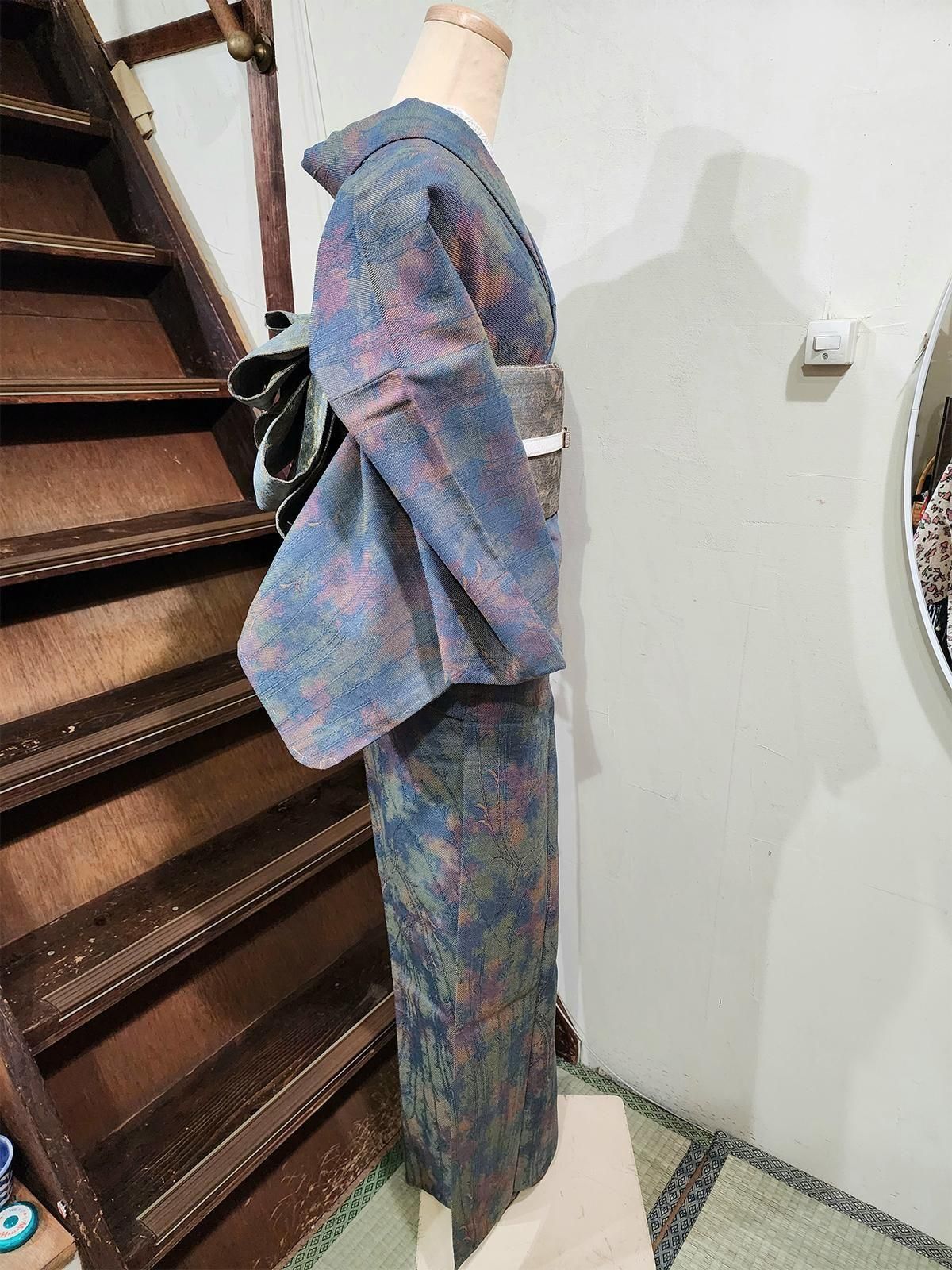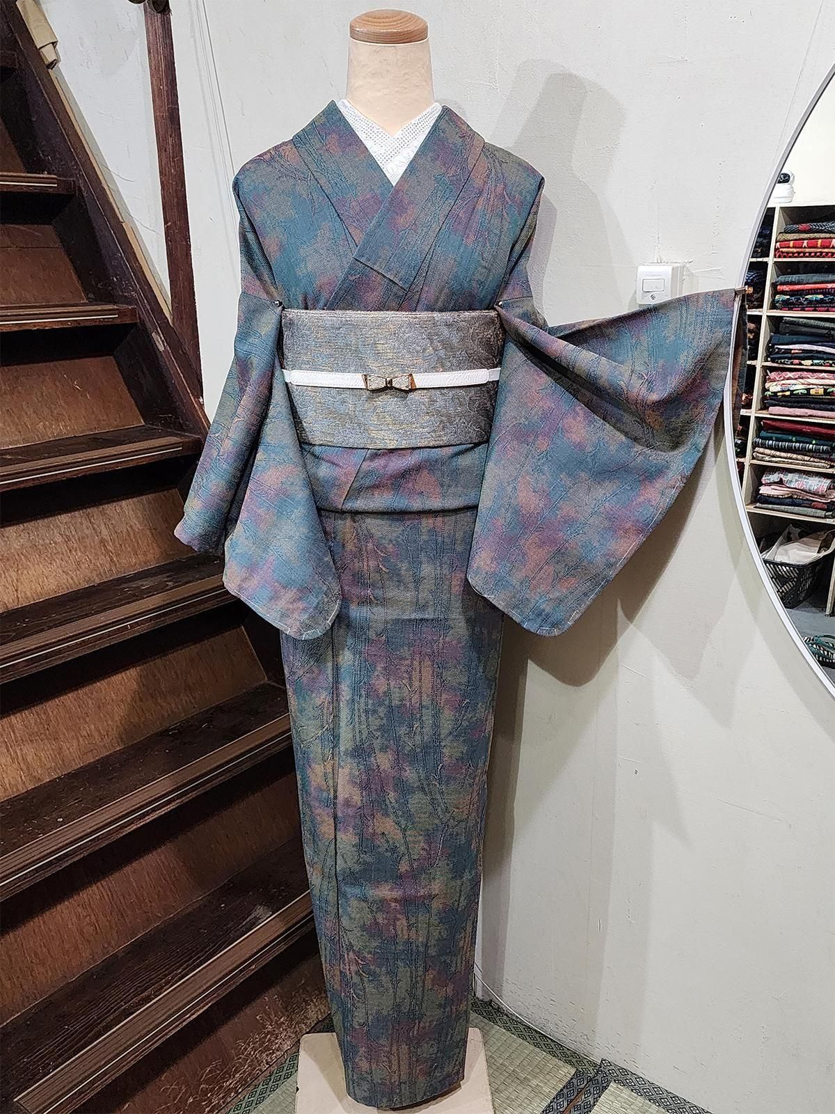 シャドウグレーにオパールのような彩りがゆらめき、柳のような水草のような枝葉がふわりと揺れるシルクウール単着物