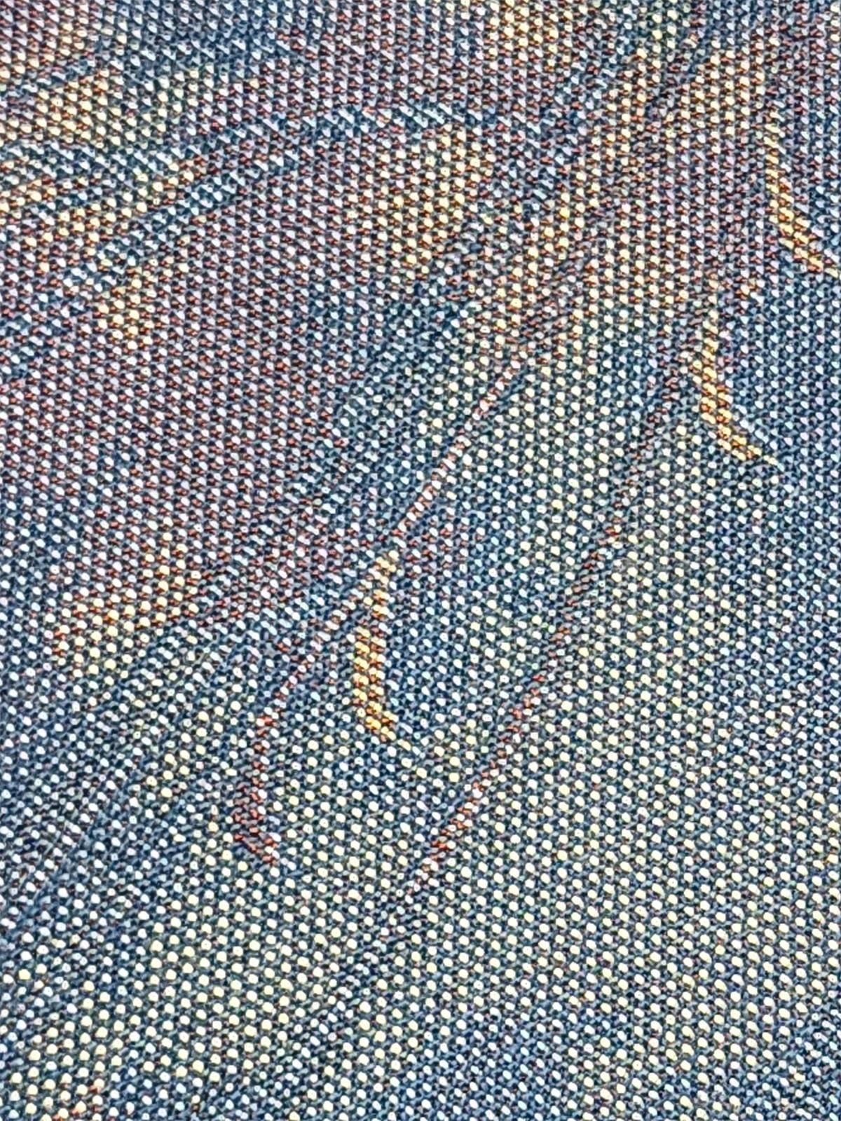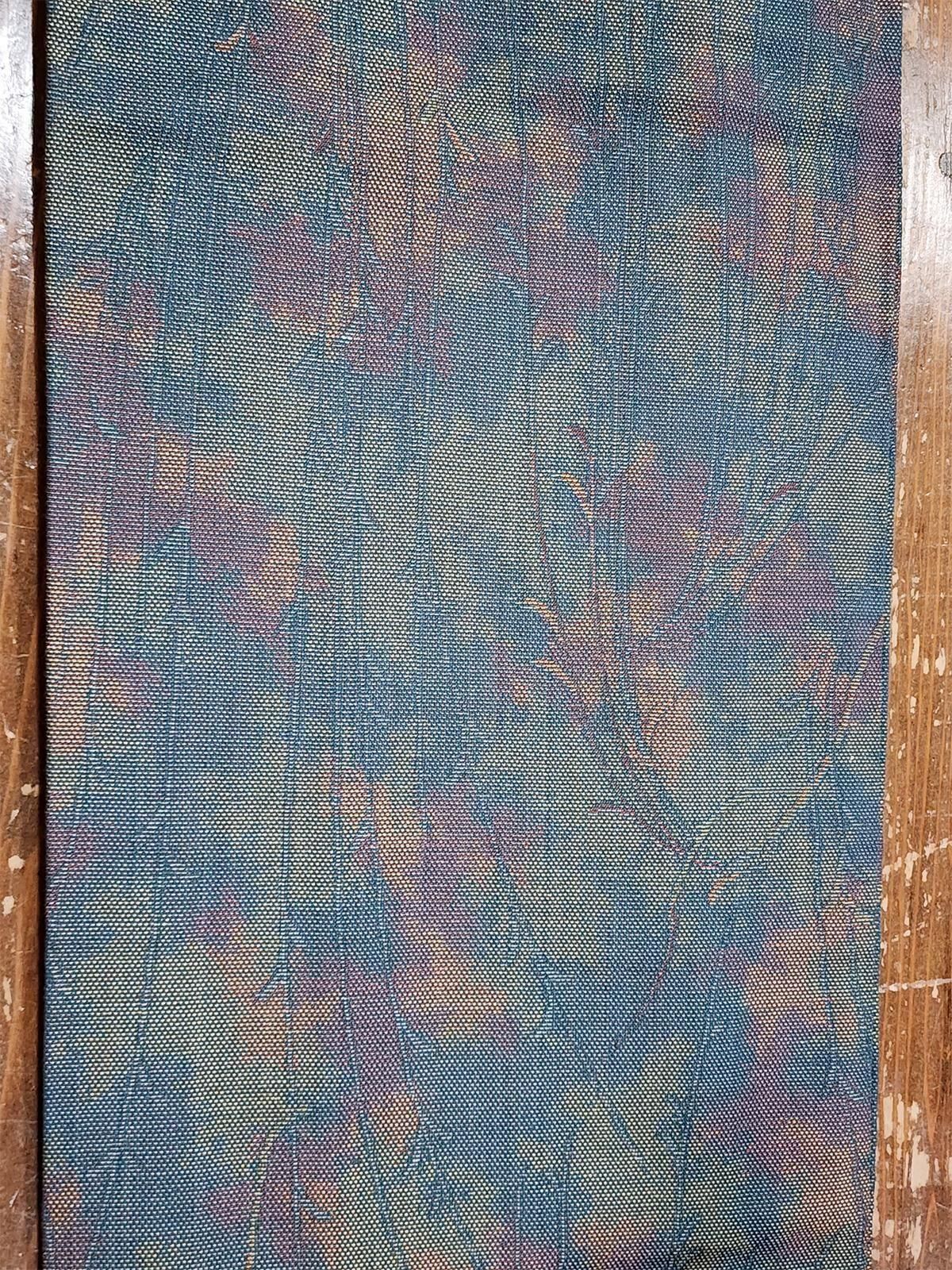 - デザイン: 光の加減でグリーンやブルーをおびて見えるニュアンスのあるノーブルなグレーに、ルージュやマスタードイエローの色糸が霞のように織り込まれ、風にふわりと揺れる柳の枝や水草を思わせる繊細な植物装飾模様がさりげなく浮かびあがる奥行きのある一枚です。