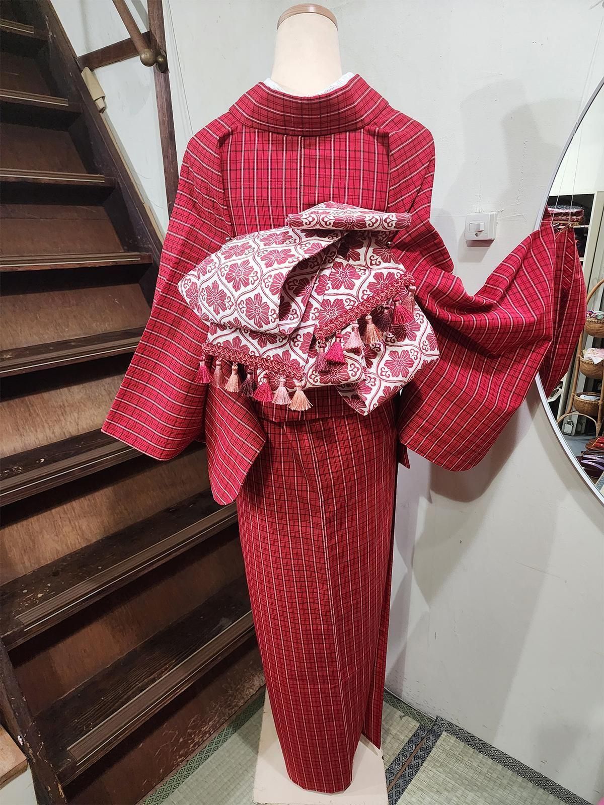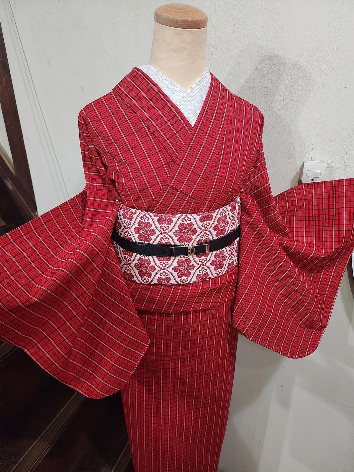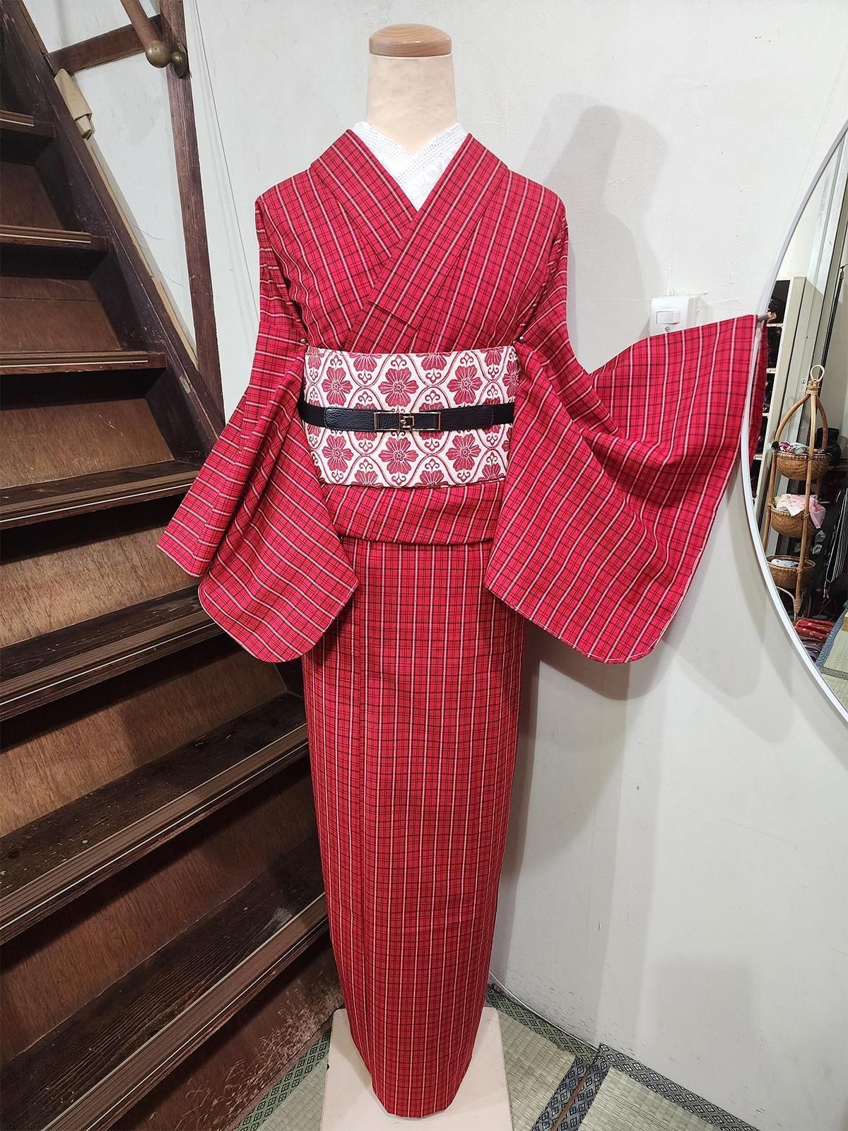 - デザイン:赤×黒にホワイトがすっきりとしたアクセントになったベーシックチェックがコーデの主役になる一枚。存在感はありつつも合わせやすく、帯や小物で表情を変えられるので、着まわし力の高さも魅力です。