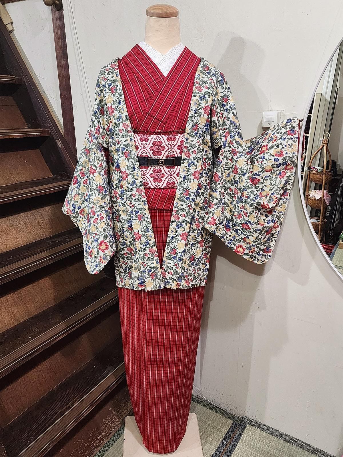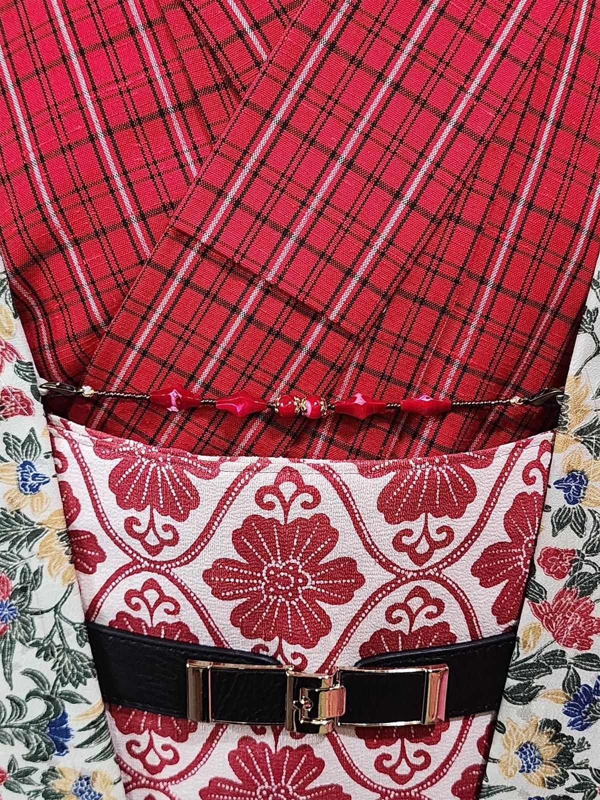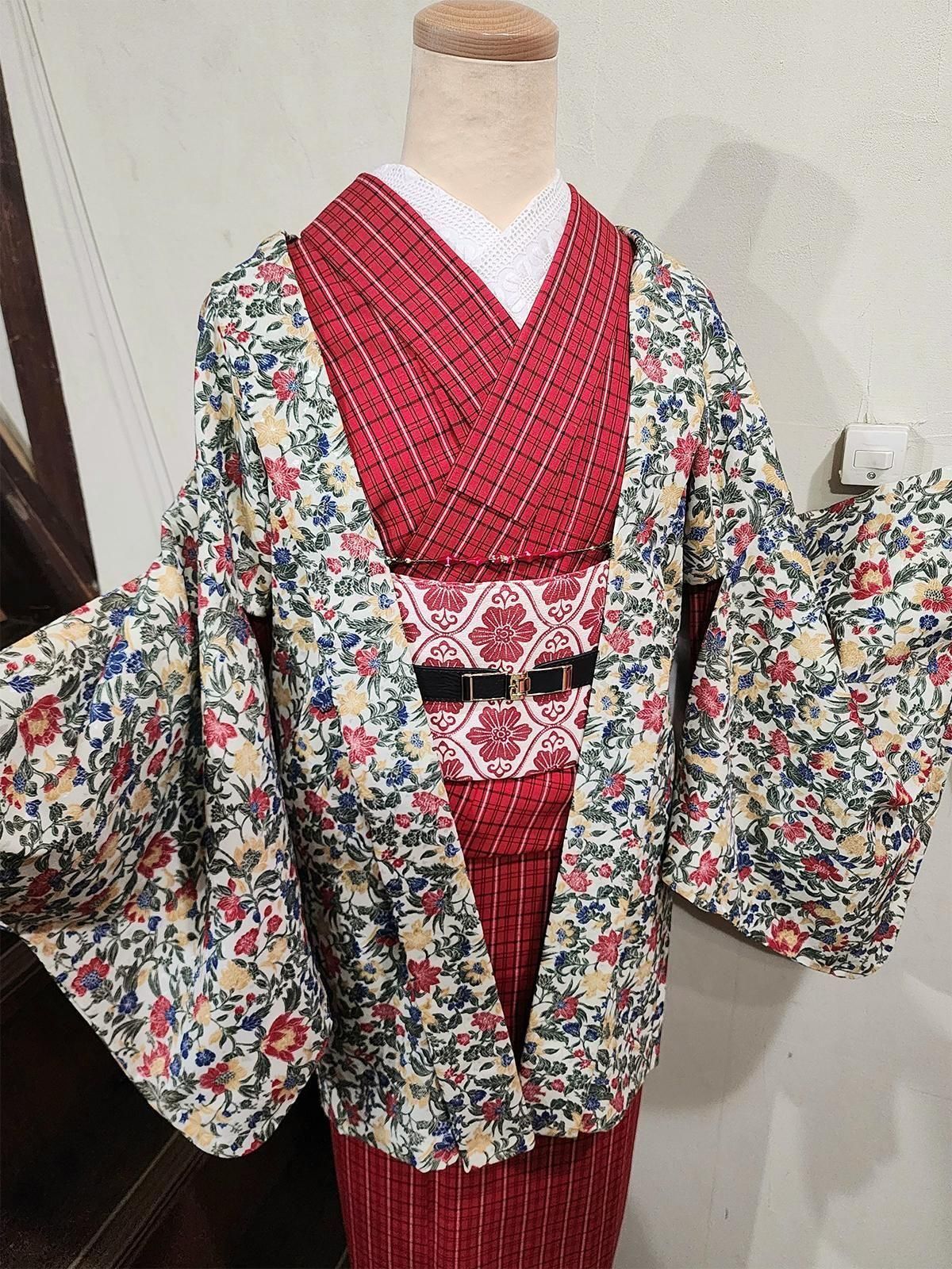 - コーデ提案: 無地の着物に重ねれば柄が主役の上品な華やぎに。赤やネイビーの差し色を拾うと統一感が出て、チェック柄や縞など“柄オン柄”も意外とまとまります。白・生成り・グレージュの帯で軽やかに、黒や濃紺で引き締めても素敵。