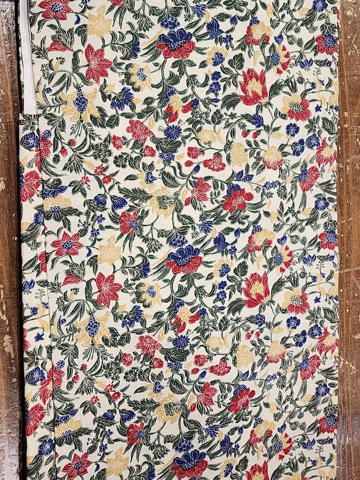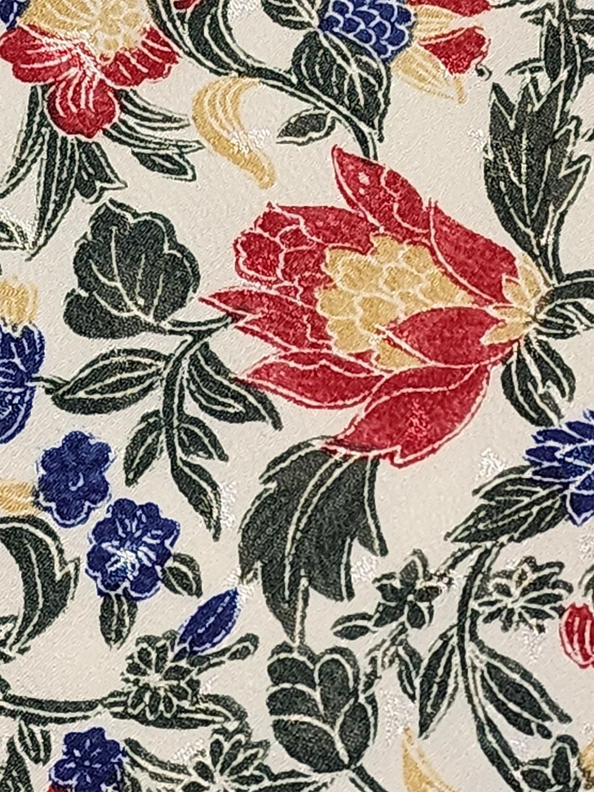 - デザイン: アイボリーの地へ、ルージュ、ロイヤルブルー、アイボリーベージュの花々と深いグリーンの蔓葉が一面に連なるアラベスク調のボタニカルデザインが染め出されたヨーロッパのビンテージファブリックのようにドラマチックな一枚。