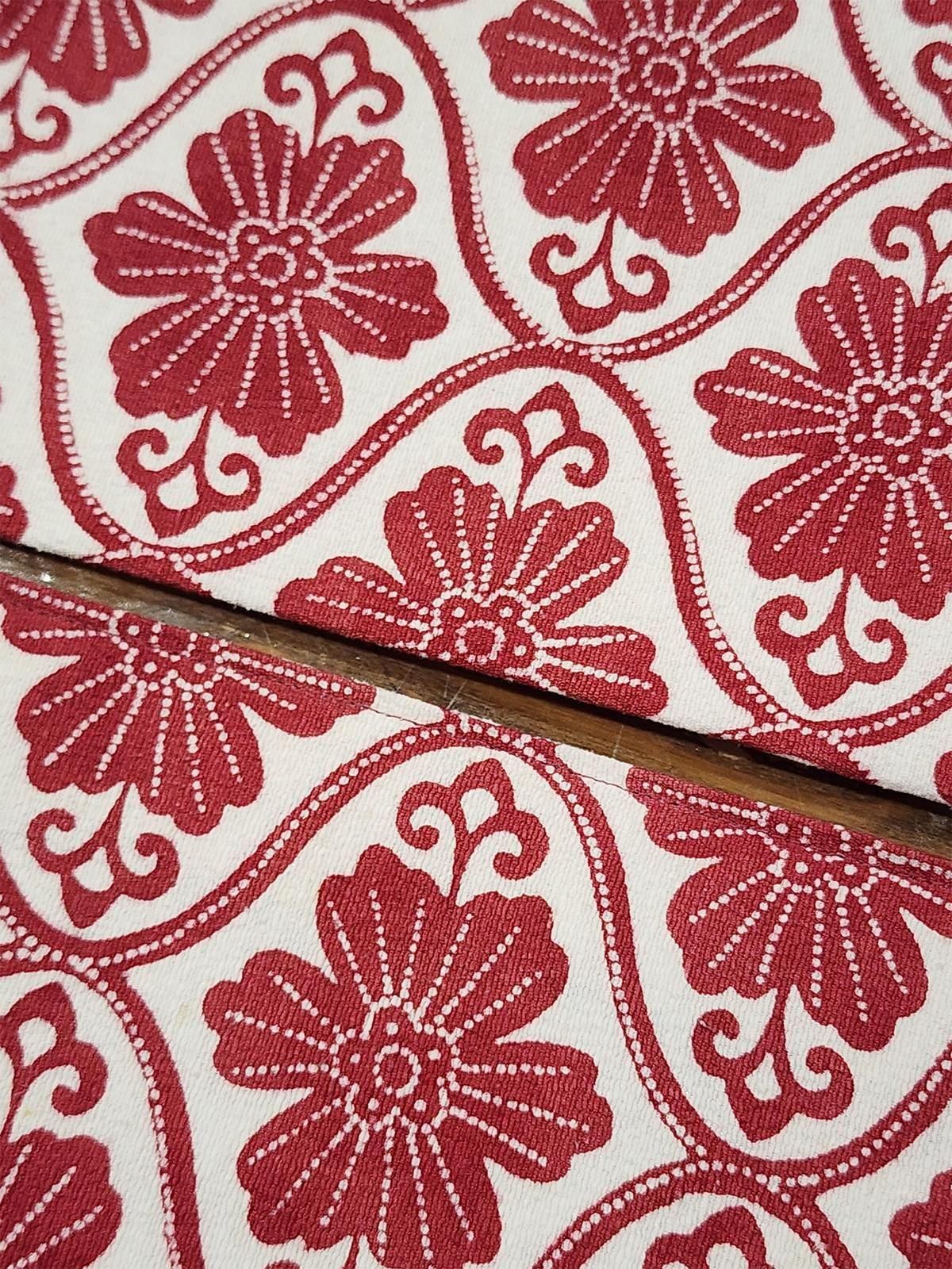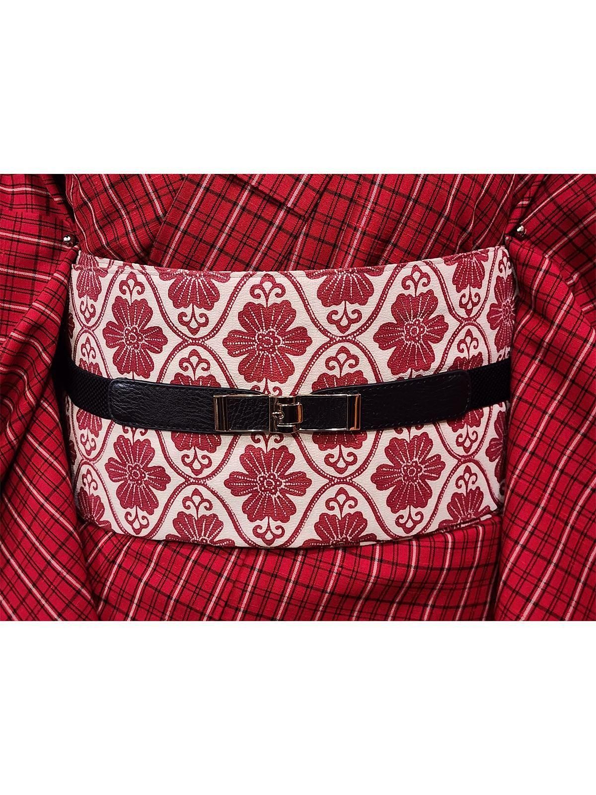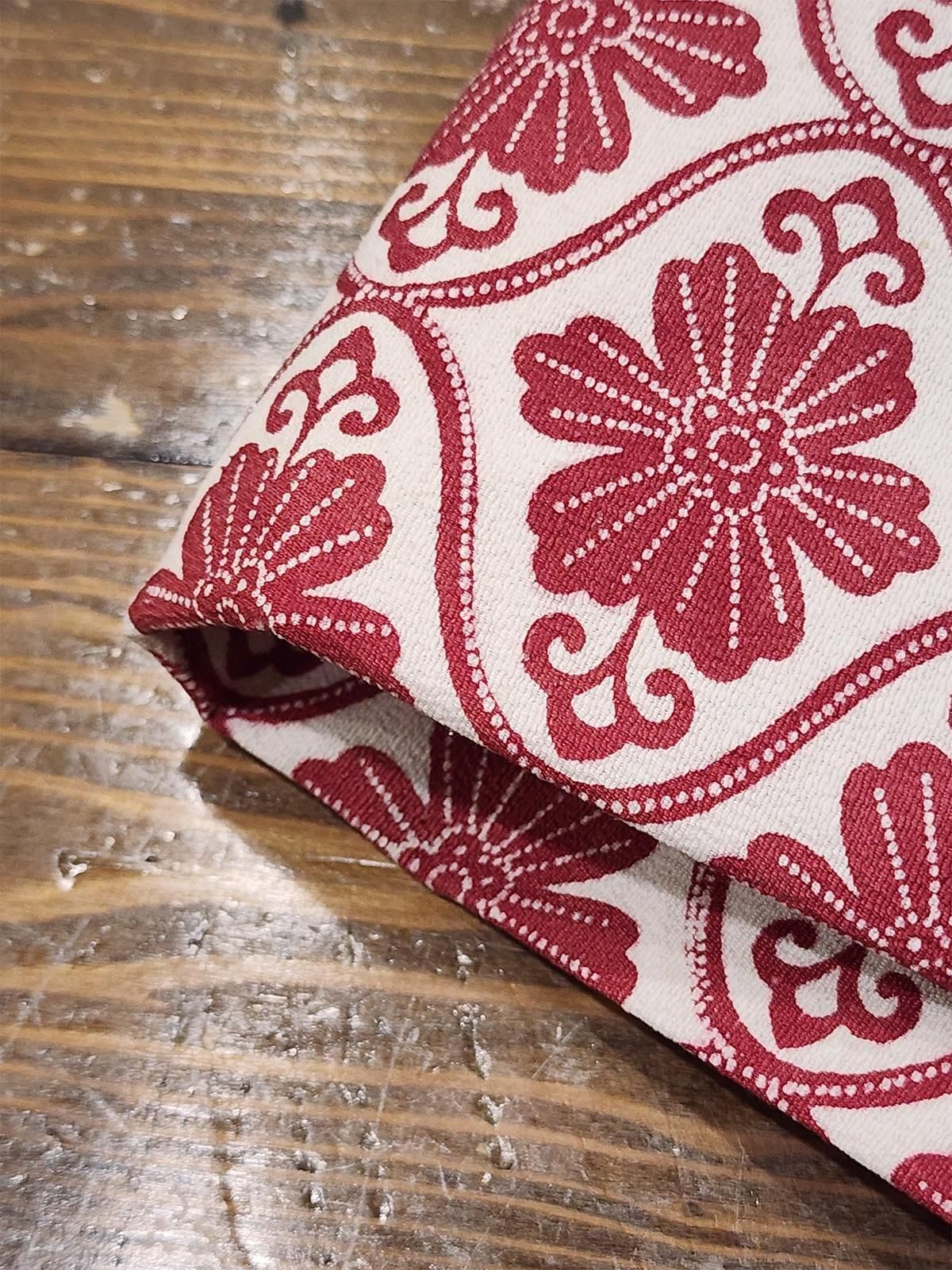 オフホワイトにルージュレッドのロマンチックタイルのような花幾何学が連なるドラマチックなデザインにタッセルが可憐に揺れるリファイン半幅帯